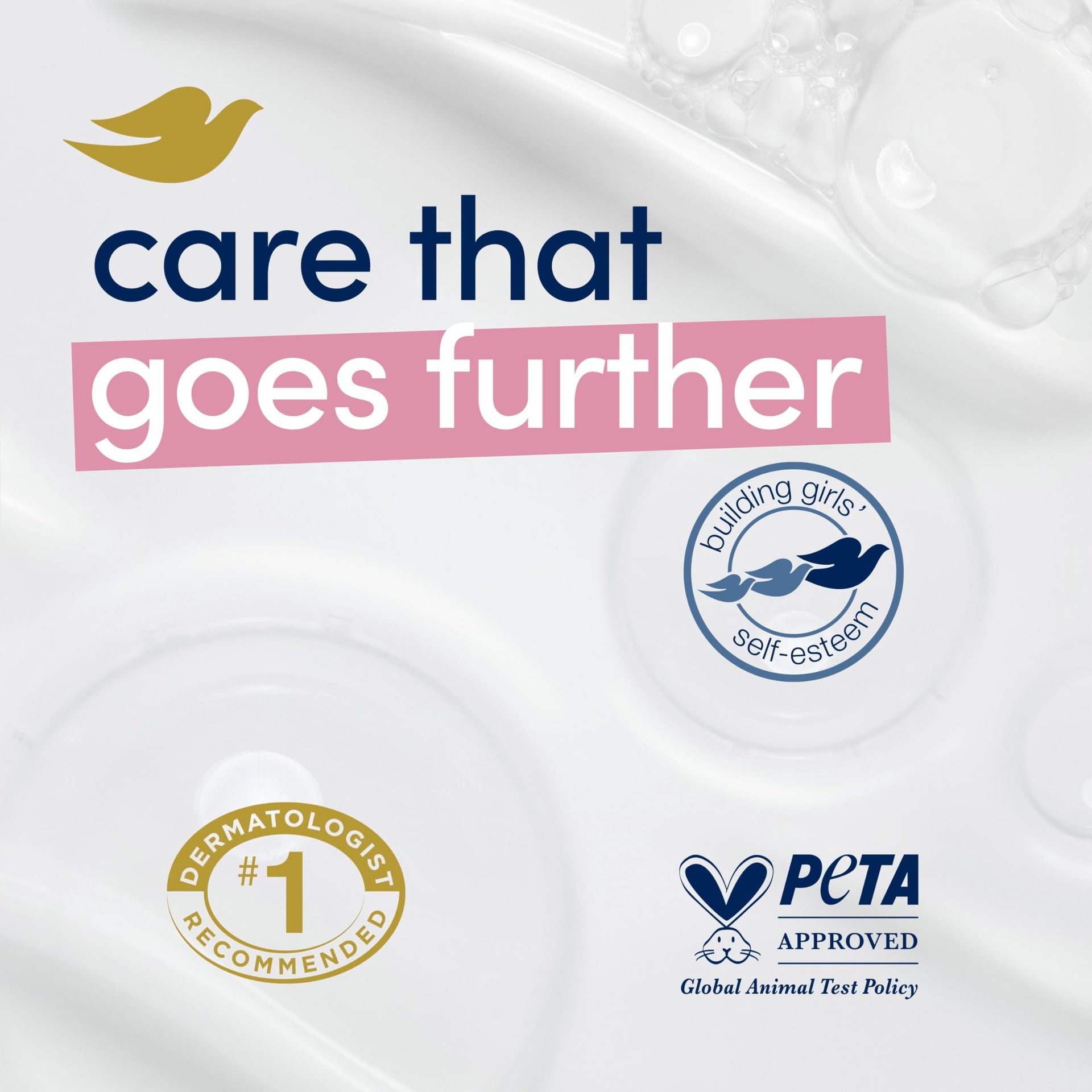 - CARE WITH YOUR CLEANSER: Globally, Dove does not test on animals and is PETA Approved. Our mission is to help the next generation of women develop a positive relationship with the way they look.