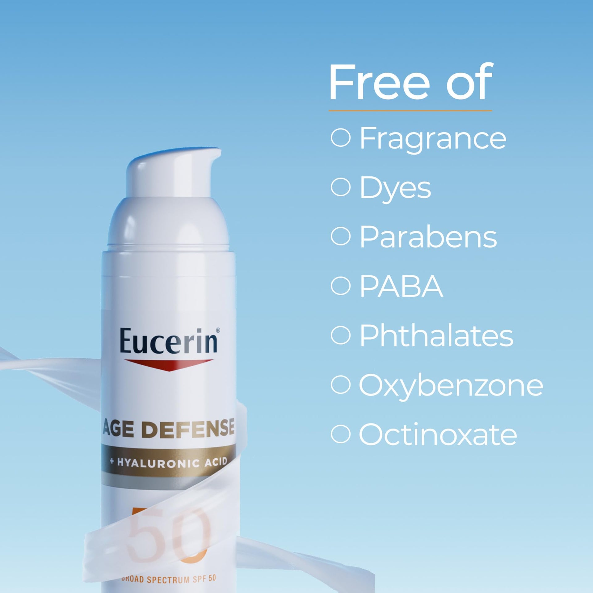 Details: Eucerin Sun Age Defense SPF 50 Face Sunscreen Lotion is a fragrance free sunscreen enriched with 5 antioxidants and Hyaluronic Acid, and visibly reduces the look of fine lines and wrinkles.(1) Eucerin Sun Age Defense features UVA/UVB sun protection plus an Advanced Antioxidant Complex, 5 AOX Shield, that goes beyond neutralizing to also guard from free radicals and help support skin health. This hyaluronic acid sunscreen face lotion with SPF 50 is non-irritating to the skin and eyes and is suitable for daily use under makeup. Eucerin Sun Age Defense Face Sunscreen SPF 50 is a non comedogenic sunscreen, so it does not clog pores or cause breakouts. Developed with dermatologists and suitable for sensitive skin, this non greasy sunscreen is hypoallergenic and free of fragrance, oil, dyes, parabens, PABA, phthalates, oxybenzone and octinoxate. Eucerin Age Defense is a travel size sunscreen that comes in a unique, premium pump dispenser. Eucerin is a dermatologist-recommended skincare brand that is based on an uncompromising approach to science. (1)with continuous use after 1 week (2)Use as directed with other Sun Protection Measures (See Drug Facts Box)