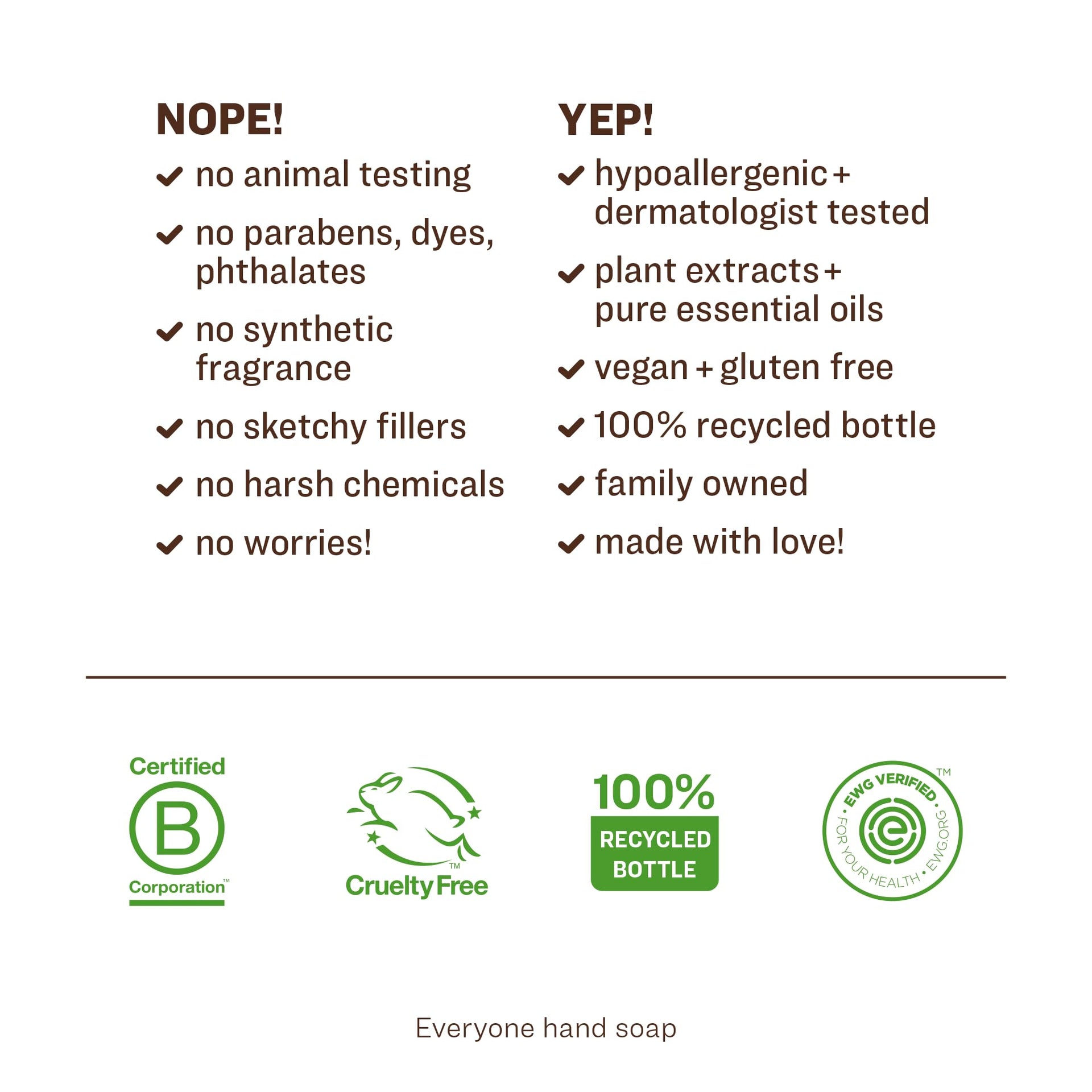 - Clean Promise: EWG Verified, GMO Free, Cruelty Free, Gluten Free, Triclosan Free and Synthetic Fragrance Free