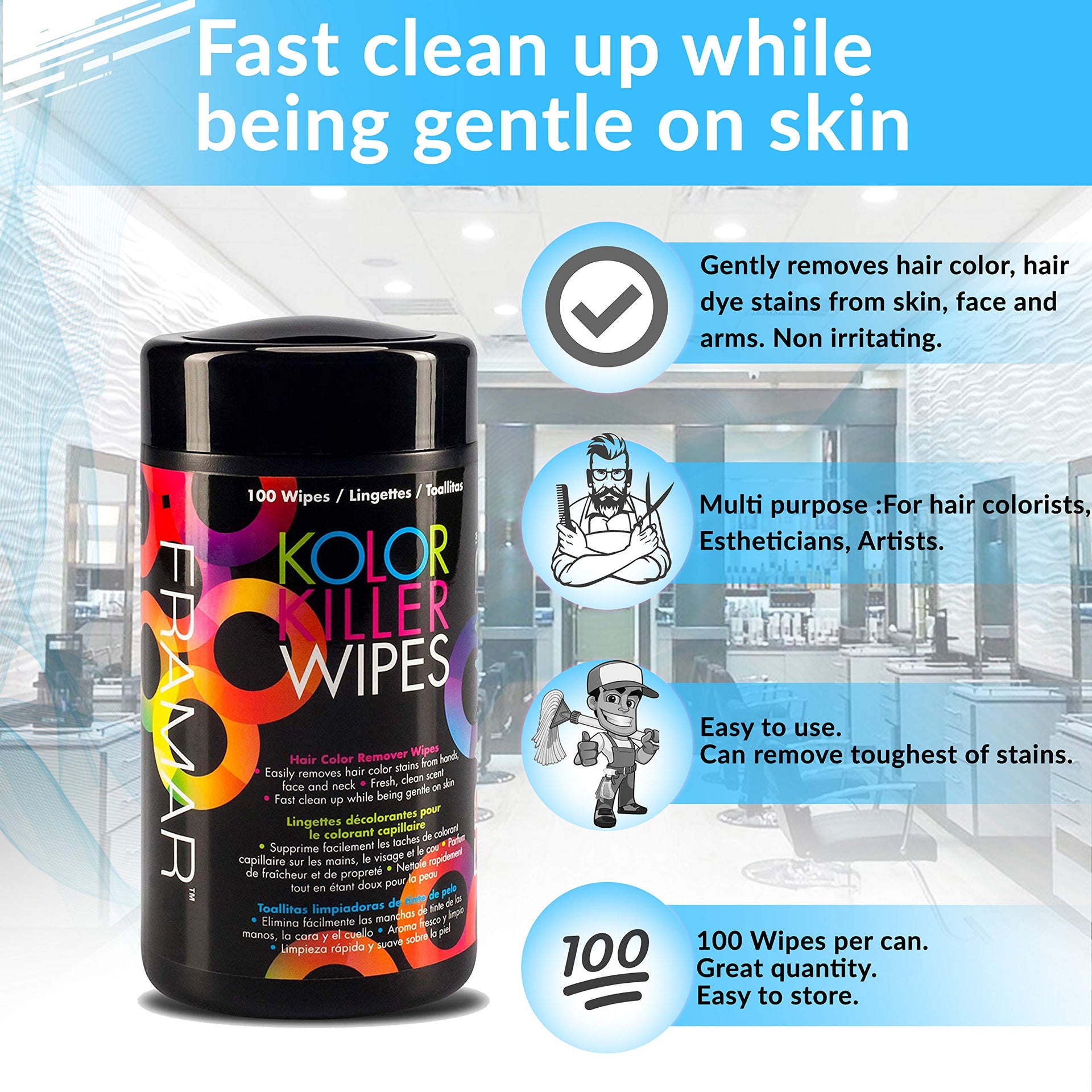 - Effective – Gentle cleaning wipes easily remove hair color, temporary hair color, or hair dye stains from hands, arms, face and neck. This hair color remover can remove even the toughest of stains on your client or yourself. Specially formulated, these cleaning wipes effectively and safely remove stains.