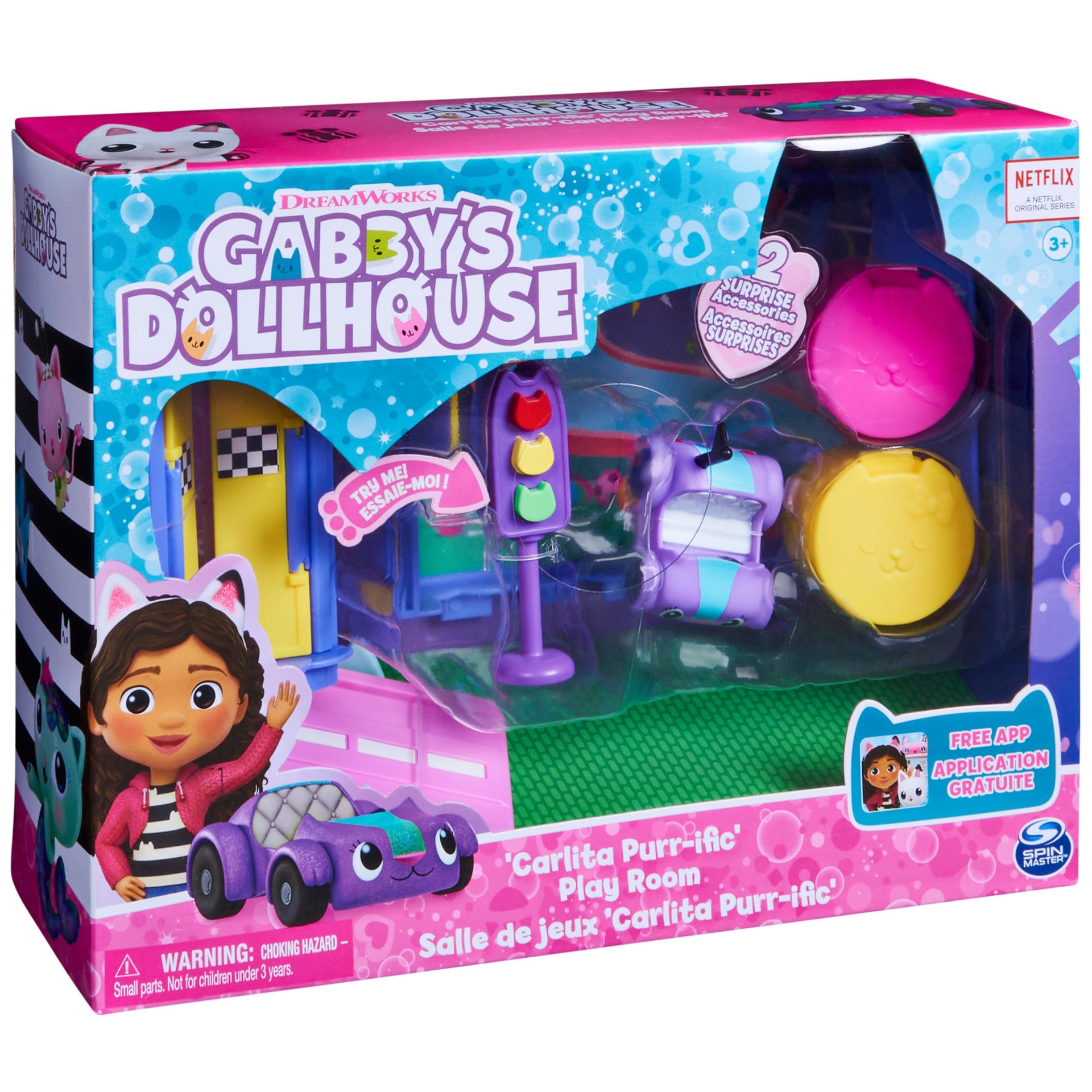 Details: Get ready for some Cat-tastic playtime adventures in the Carlita Purr-ific Play Room! This deluxe Gabby’s Dollhouse playset is filled with fun and exciting details to explore, bringing this magical room from the show to life! Featuring a mini Carlita toy car, with real working wheels, a bedroom door with a checkered flag design, along with a street-themed see-saw ramp and miniature stop-light that features a Hamster Kitty crossing-guard graphic that pops out when you press on the green kitty shape! Then, unbox your Dollhouse Deliveries, just like Gabby does in the show, and discover two surprise toys: a toy traffic cone and a gas can, to use when Carlita is off on an adventure! For even more fun, use Carlita’s Purr-ific Play Room alongside MerCat in the Primp and Pamper Bathroom and Pillow Cat’s Sweet Dreams Bedroom (each sold separately,) by sliding them into Gabby’s Purrfect Dollhouse (sold separately) to build out your Gabby’s Dollhouse world! For one last surprise, scan the QR code found inside one of the Dollhouse Deliveries to unlock a special reward in the free Gabby’s Dollhouse App (available on iOS and Android). Gabby’s Dollhouse toys, plush toys, toy figures and playsets are educational toys that make great gifts for kids, ages 3 and up, as they help to expand his or her imaginations through exciting and creative pretend play!