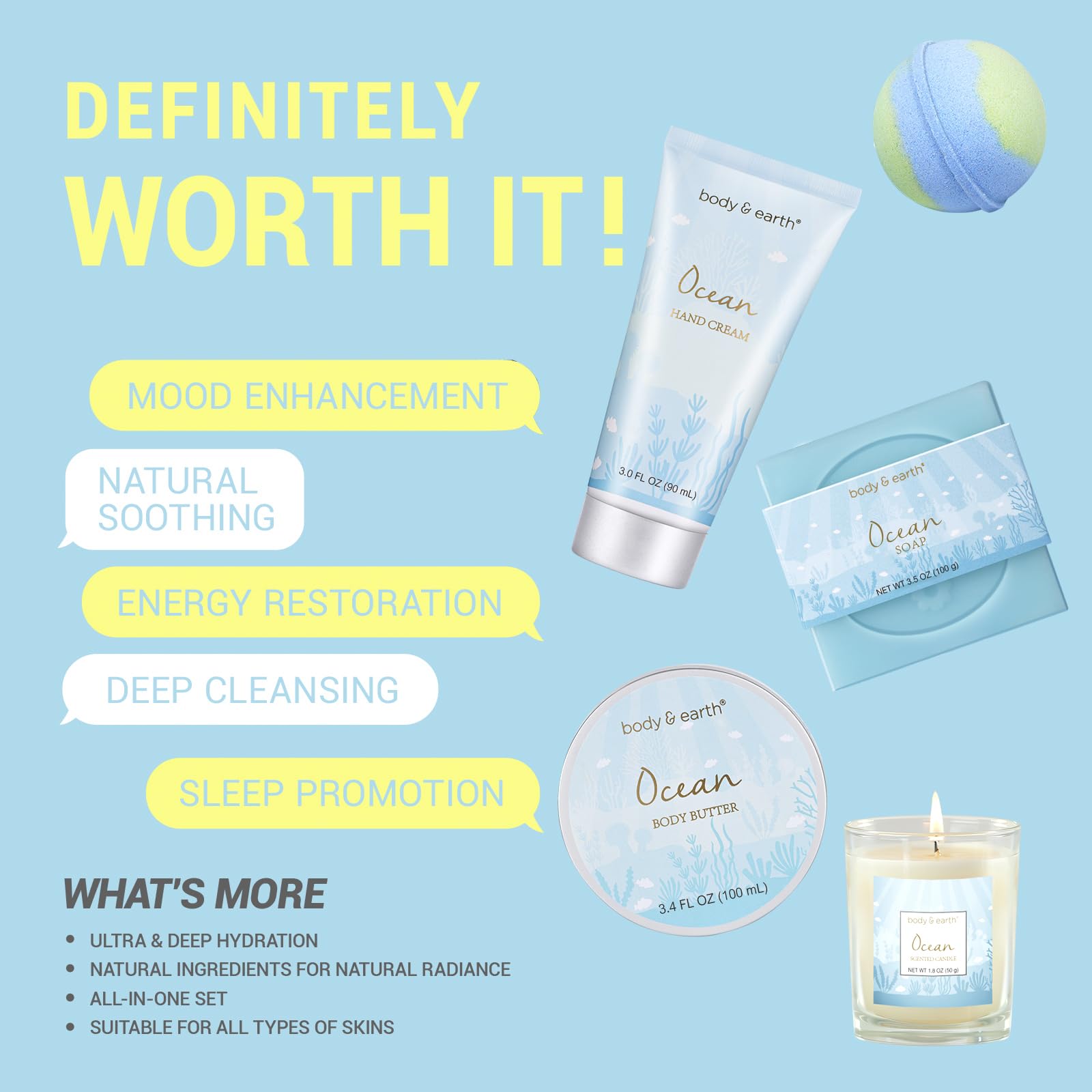 Bath & Body Gift Set for Women – 5-Piece Ocean Scent Spa Gifts with Candle, Body Butter, Hand Cream & Bath Bomb, Christmas Present
