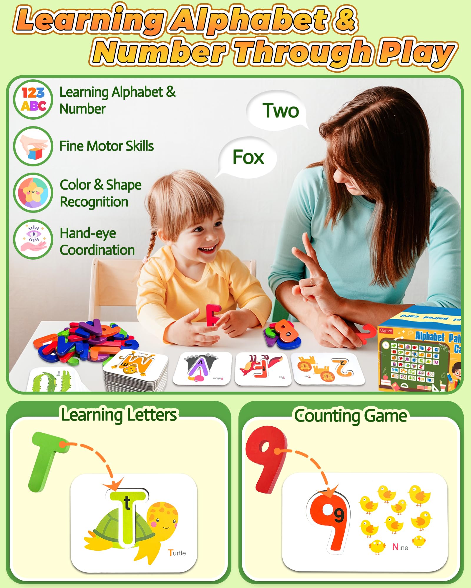 Gojmzo Alphabet Flash Cards & Wooden Blocks, ABC Learning, Numbers & Sight Words Game for Toddlers & Preschool Montessori Educational Toy 3+