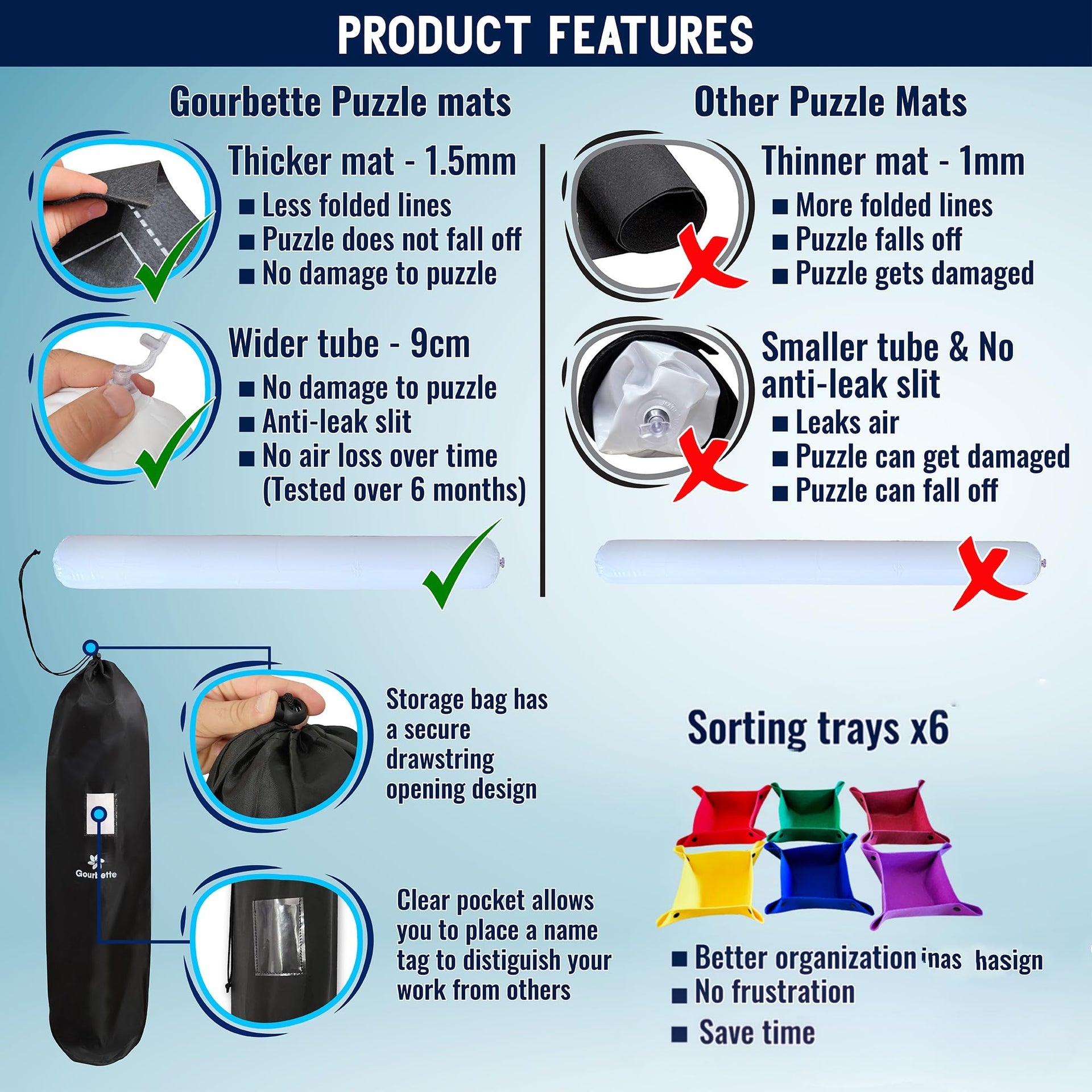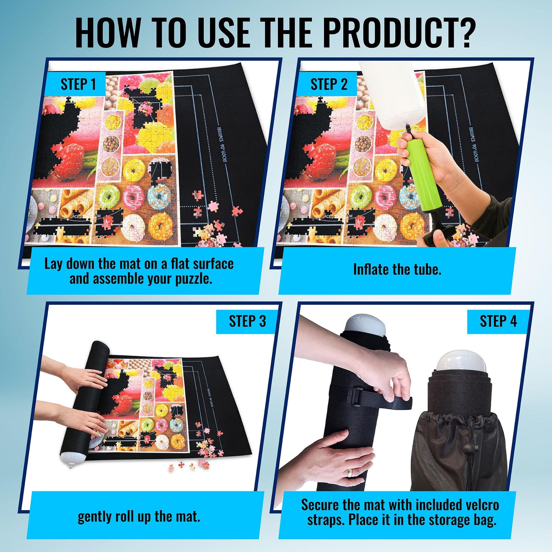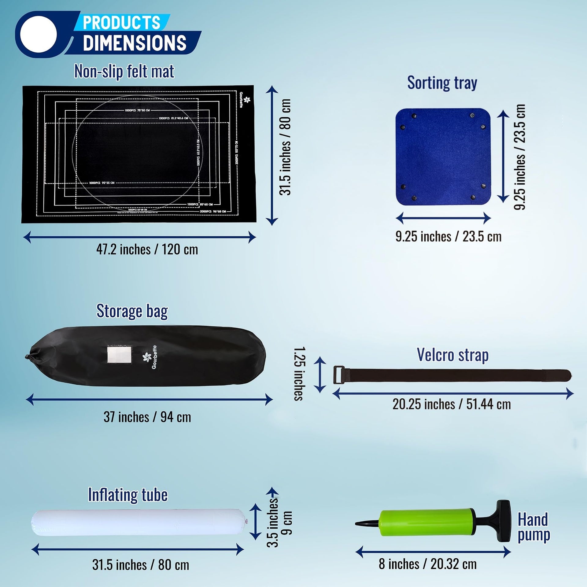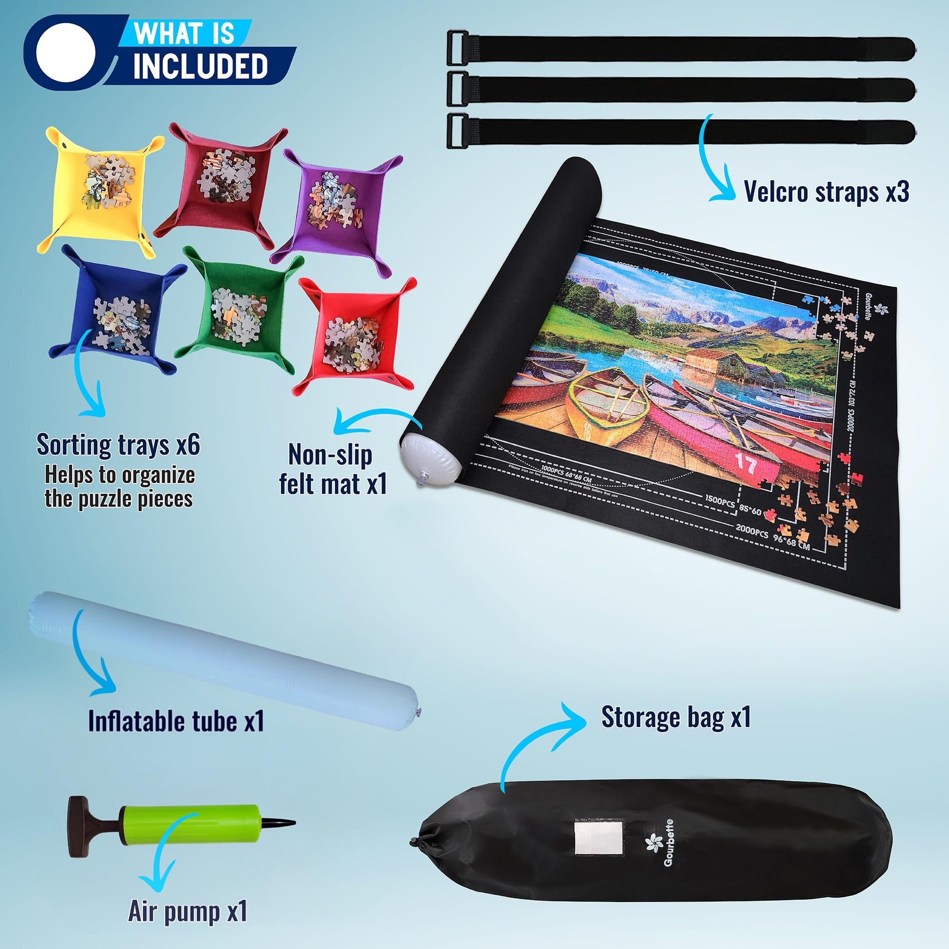 - The ultimate jigsaw puzzle roll storage kit- Includes everything you need to build your puzzle, 1 jigsaw puzzle felt mat, 6 puzzle pieces sorting trays, 3 Velcro straps, 1 inflatable tube, 1 hand pump and 1 carrying case. Transfer your puzzle from one place to another with ease and convenience.