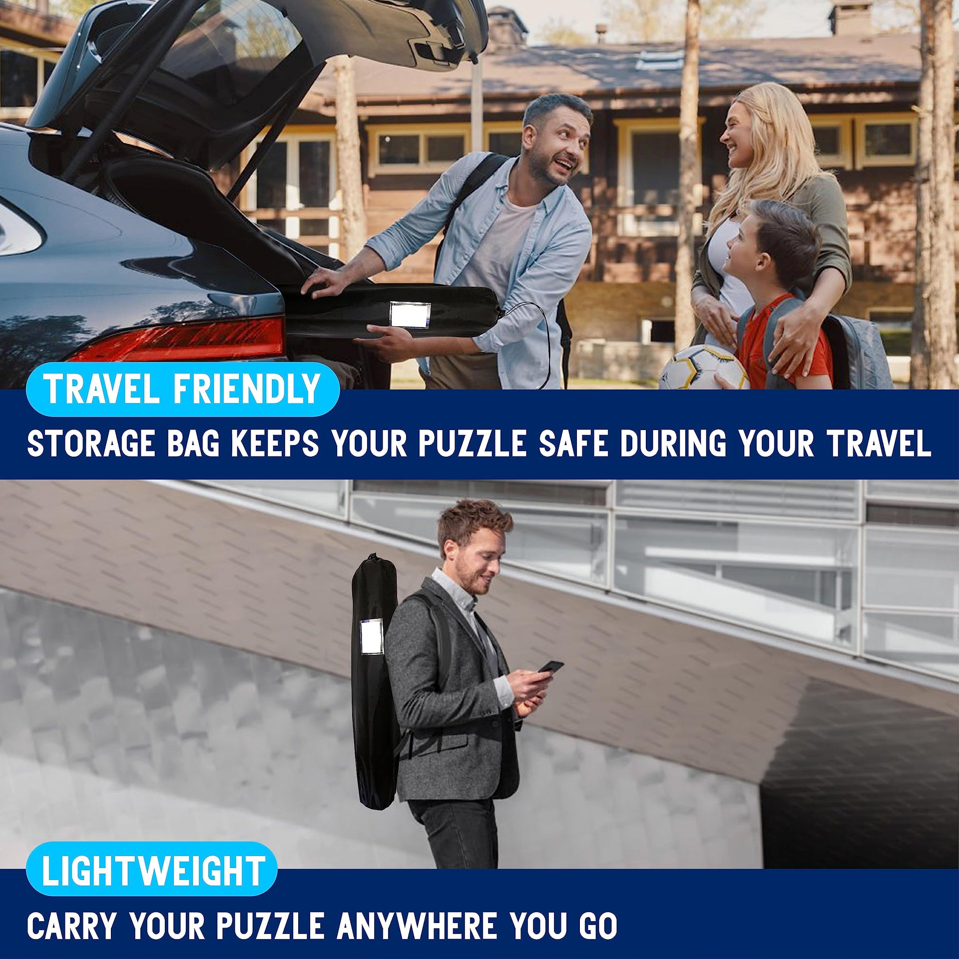 - Easy Setup and Clean up - Simply Lay down the puzzle board and start working on your puzzle game. When you want to pause on your unfinished puzzle, simply Inflate the tube, roll up the puzzle piece sorter tray, Secure the puzzle saver mat with included Velcro straps then store it in the included storage bag.