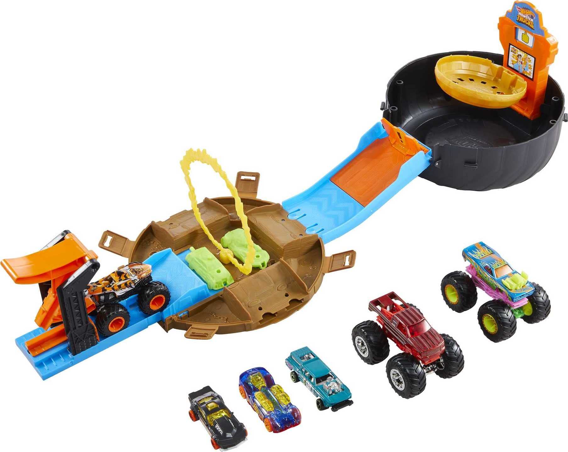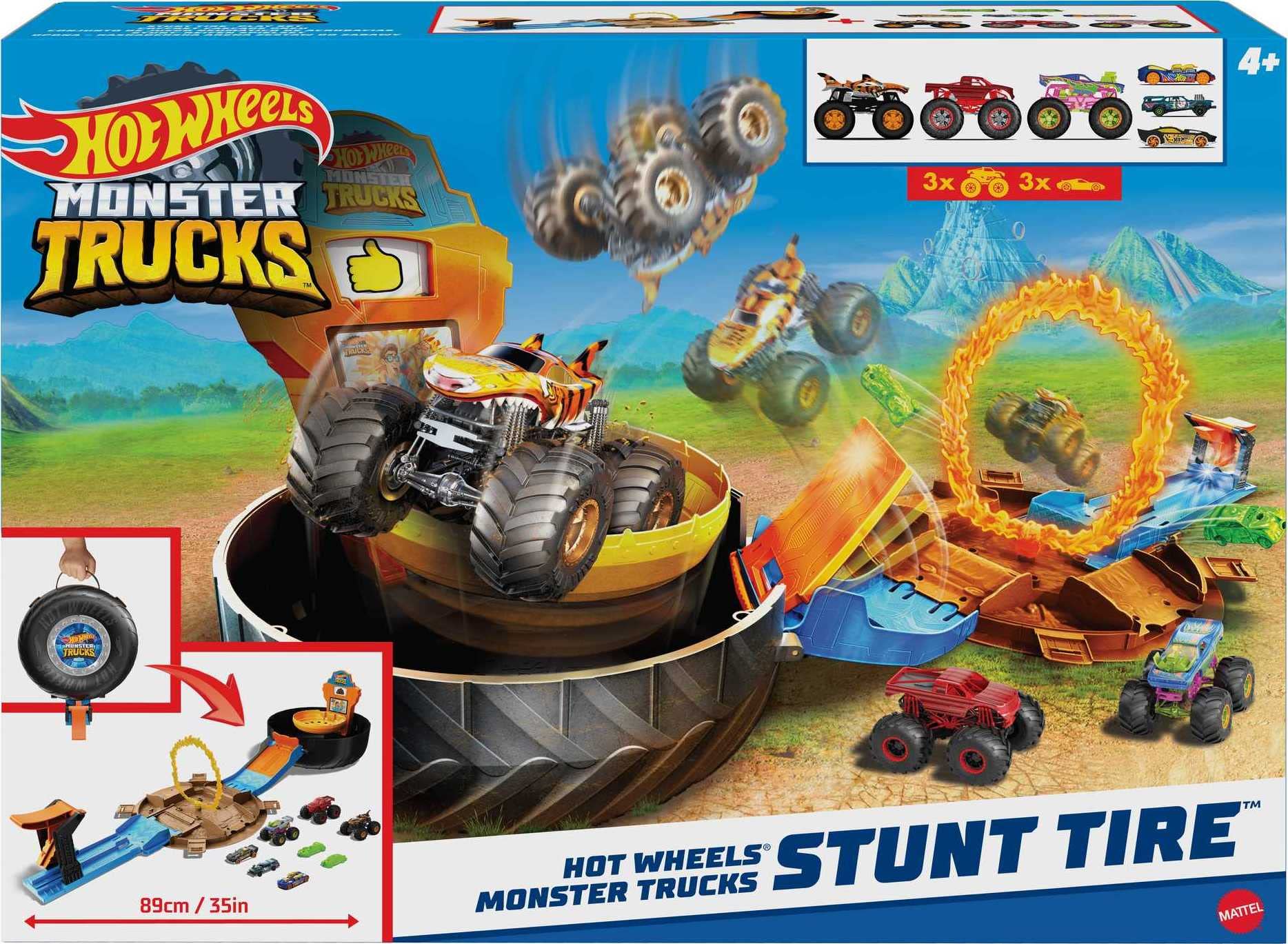 Hot Wheels Toy Monster Trucks Playset, Tire-Shaped Case Transforms into Race Course, 3 Trucks & 4 Cars in 1:64 Scale, Stunt Tire (Amazon Exclusive)