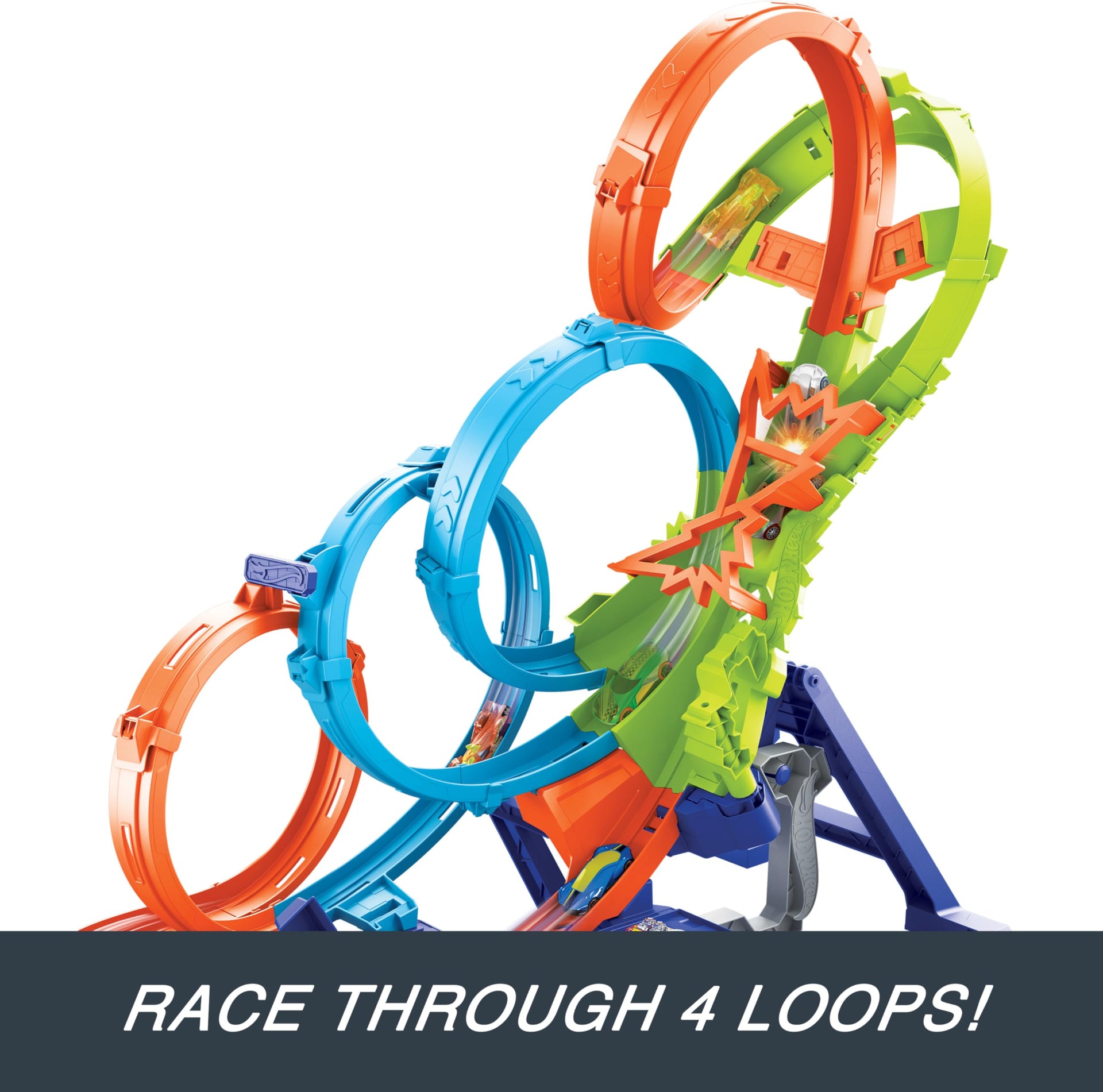 Hot Wheels Track Set with 4 Loops, 3-Way Crash Zone & Motorized Booster, Folds for Storage, with 1:64 Scale Toy Car