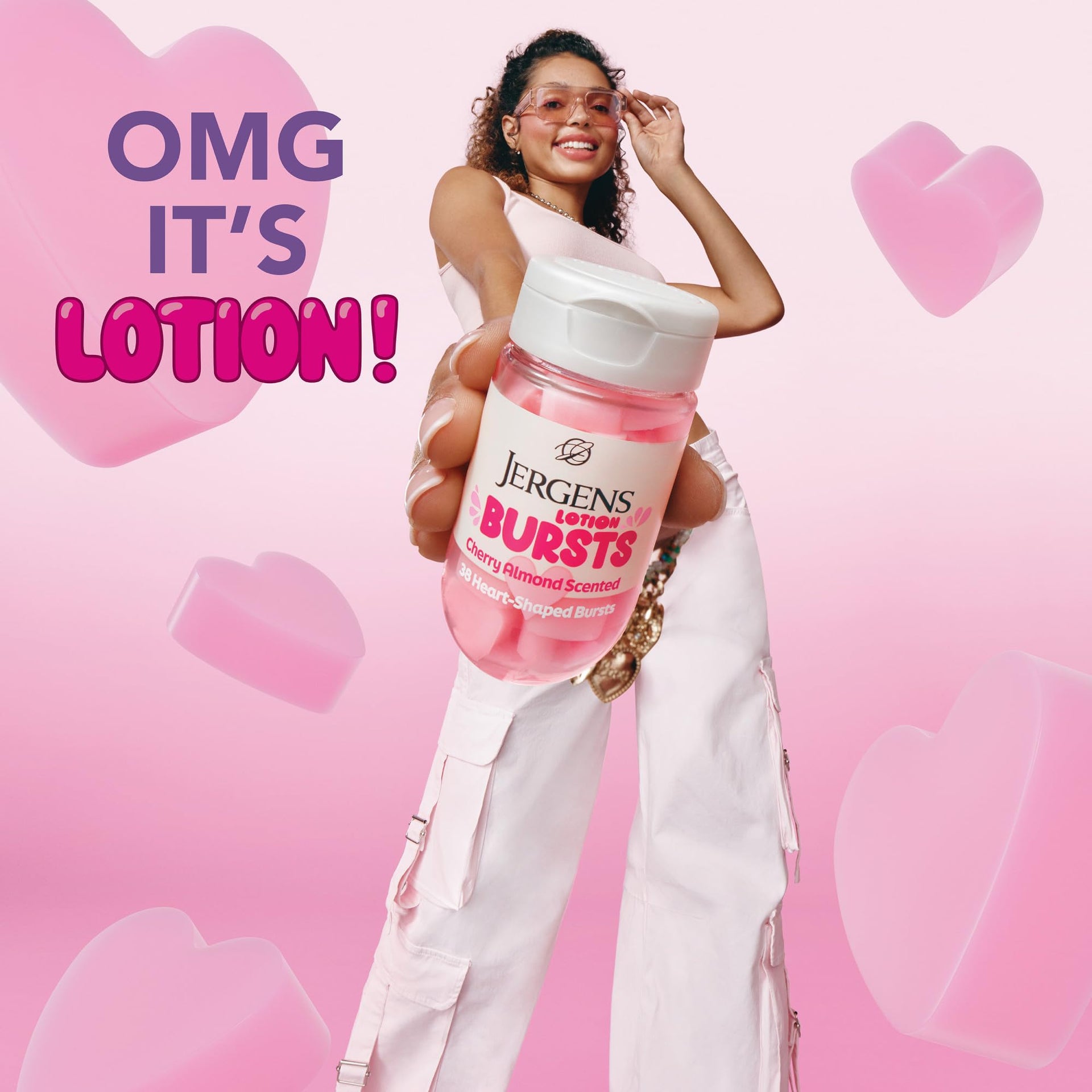 Details: Wait… a moisturizer in fun-shaped squishy bursts? Yep. That’s right. It’s squishy! It’s lotion! It’s squishy Jergens Bursts! Try it for yourself: Jergens Cherry Almond Lotion Bursts. Our little pop of hydration in a heart shape in our iconic cherry almond scent. These bursts deliver a delightfully scented, moisturizer moment. Just squish and smooth them over your skin. The result is long-lasting, 24-hour hydration. Each fun-shaped Burst is curated with the beloved O.G. Jergens moisturizer, which makes our Jergens Lotion Bursts help your skin look and feel hydrated, soft, and smooth. Squish it, smooth it, love it. To use these cute little Lotion Bursts, place in hand, smoosh, squish, or rub into your desired body part, and then use it as you would any other lotion–but it’s way more fun! Squish it, smooth it, love it. Jergens Cherry Almond Lotion Bursts are an undeniably adorable way to hydrate your skin. Big fan of the color pink? How about hearts? Do you adore the scent of cherry almond? If so, you’ll love these pink hearts featuring a classic cherry almond scent. Are you searching for gifts for teens? Jergens Cherry Almond Lotion Bursts are the cutest for teenage skin care. As teen girl gifts, these moisture bursts will be love at first squish! Plus Jergens is a brand you’ve always trusted for lotion with ingredients you can feel good about. Jergens Cherry Almond Lotion Bursts are not only dermatologist tested, they are also cruelty free and paraben free too. Each incredible, little moisturizer is a need-to-squeeze burst of lotion you’ll love, so go on and heart it!
