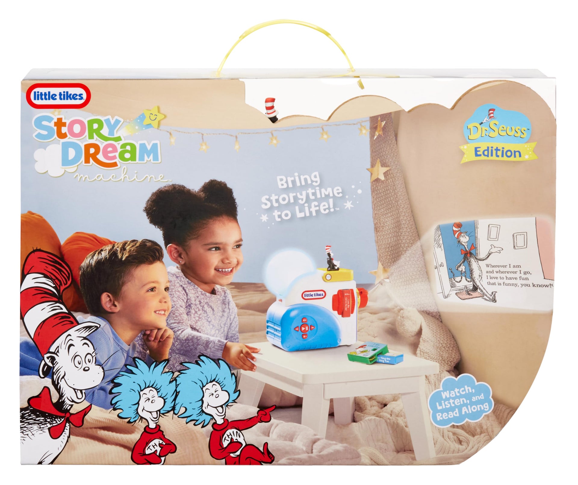Details: Watch the adventures of Dr. Seuss come to life with the Little Tikes Story Dream Machine Dr. Seuss Starter Pack! With this kid-friendly projector, children can watch, listen, and read along to these action-packed stories as they shine bright on the wall. This unique storytime experience combines imagination with elementary literacy training. The blend of auditory and visual elements makes for a fun storytelling experience that builds kids’ confidence and excitement about reading. This Story Dream Machine™ collection includes three stories and a character figurine for on-the-go storytelling. Colorful lights and sound effects help each story magically unfold, and simple controls allow your child to change the volume, fast forward, and rewind the story with ease. It’s also easy to pack up to bring storytime anywhere. This magical storytelling experience is perfect for sleepovers, family trips, or home. At bedtime, the machine doubles as a white noise nightlight to help soothe children to sleep. The always-expanding Little Tikes library offers a great variety of classic and new tales to choose from to bring storytime to life. Additional story cartridges and characters sold separately. Recommended projection distance is 2 to 6 feet.
