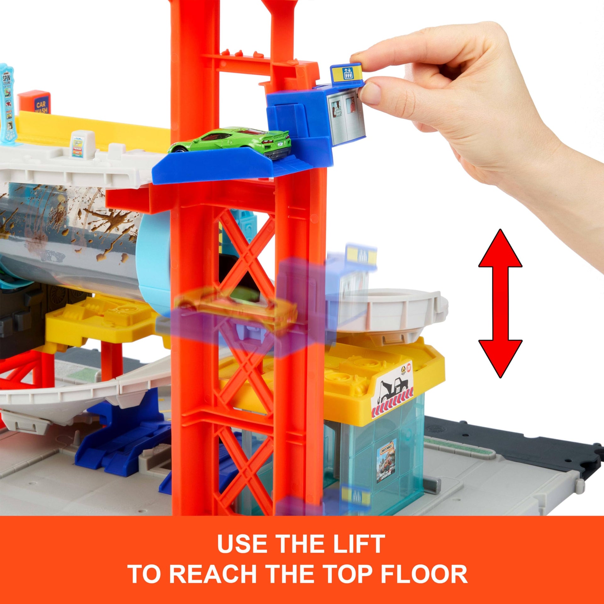 Matchbox Toy Car Track Set, Spin Cyclone Car Wash Playset with 1:64 Scale Corvette & Tow Truck, Features Spinning Wash Tunnel, Tune-Up Shop & Parking
