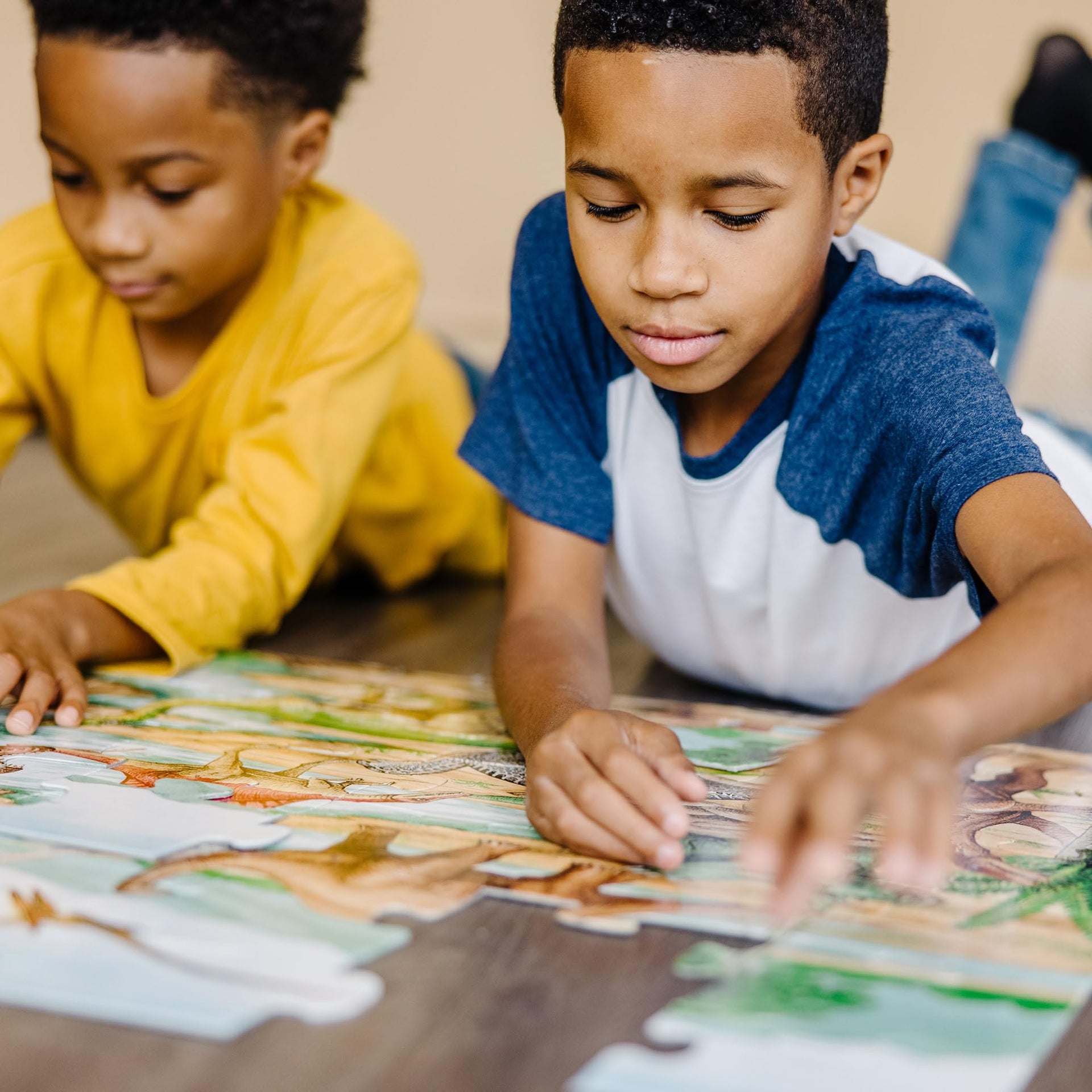 Kids' excitement and interest in dinosaurs will never go extinct! This jumbo Dinosaurs Floor Puzzle features beautiful original artwork that depicts a scene from prehistoric times. It includes images of kids' favorite dinosaurs including a spiny stegosaurus, a flying pterodactyl, and a mighty t-Rex. The floor puzzle measures an impressive three feet x two feet when it's assembled, and the 48 extra-thick cardboard pieces feature an easy-to-clean surface to keep this exciting floor puzzle looking like new. Playing with puzzles is a great way for kids to explore their creativity while developing their cognitive, physical, and emotional skills. When children work on puzzles, they are fine-tuning their gross motor skills, improving their hand-eye coordination, strengthening their problem-solving skills, and beginning to develop logic and critical thinking processes. This Melissa & Doug Dinosaurs Floor Puzzle makes an exceptional gift for preschoolers and kids ages three and older for hands-on, screen-free play. This product is certified by the Forest Stewardship Council. FSC certification ensures that products come from responsibly managed forests that provide environmental, social, and economic benefits, and that forests are protected for future generations. Please note that FSC certification applies to new inventory only (FSC C156584)