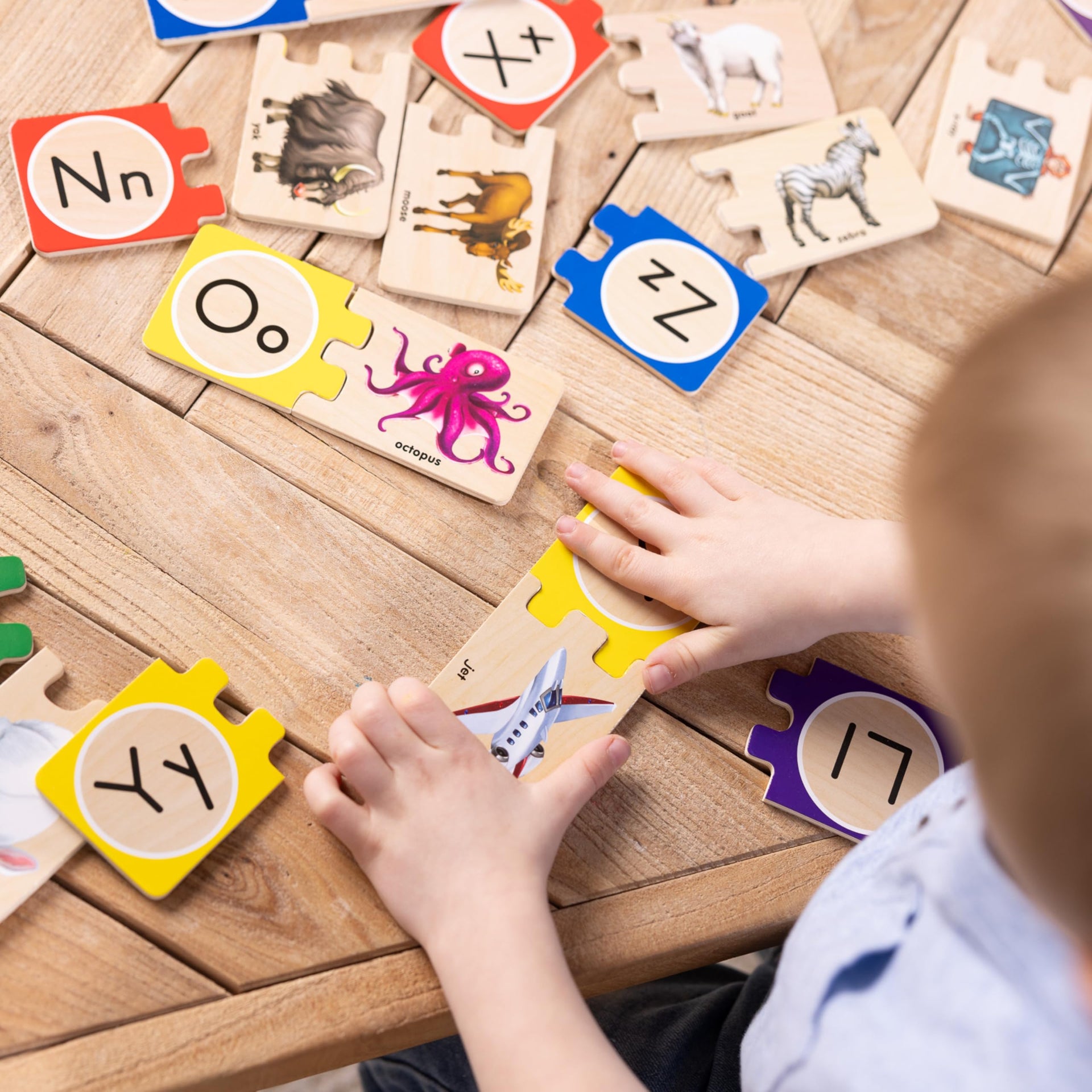 - Self-Correcting Puzzle: Each puzzle piece shows a capital or lowercase letter, and a labeled image, that only fits with its correct match, so kids can test, try again, and build confidence through hands-on discovery