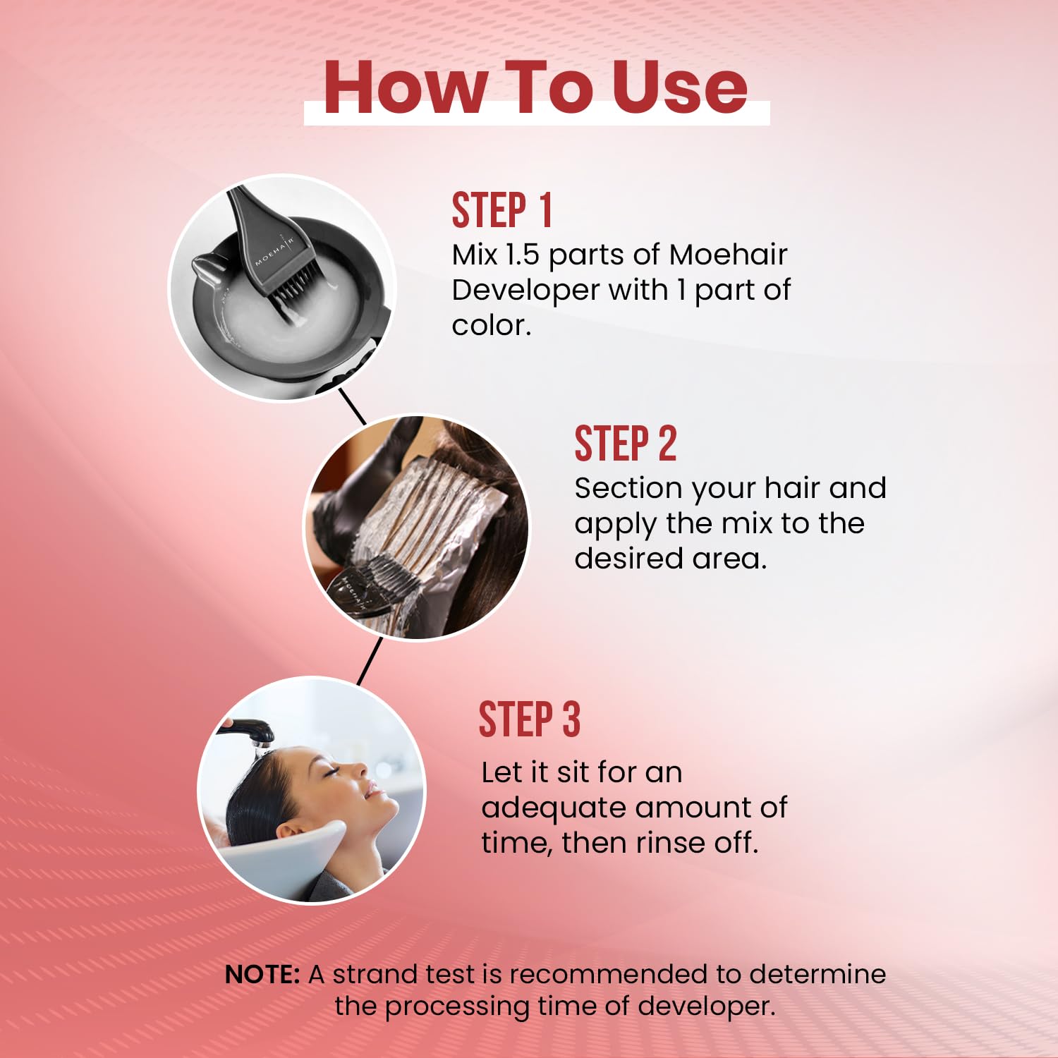 - ✔️ HOW TO USE THE 5 VOLUME DEVELOPER — Mix Moehair 5 Volume Hair Developer Creme with the color of your choice in a bowl. Part your hair and apply the mix to the desired area. Let it sit for an adequate amount of time, say 30 minutes. Rinse thoroughly with water. Perform a strand test before using a 5 volume creme developer. Being a salon-exclusive developer for hair coloring, it is best to seek advice from an experienced hairstylist and be sure about the right volume of hydrogen peroxide