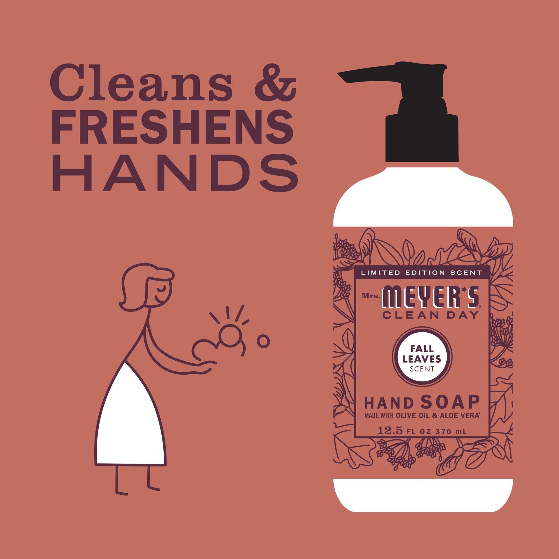 Details: Mrs. Meyer’s Clean Day Fall Leaves Liquid Hand Soap is specifically made to clean and freshen your hands without over drying, while also providing a special limited edition seasonal scent. And oh, a touch of autumn! With this Hand Soap, your senses fill as fall leaves drop into your life. Bright and crisp, with scents so fresh, woody and lightly sweet, like a cool breeze with a warm touch. This hardworking Hand Soap formula contains olive oil, aloe vera, essential oils and thoughtfully chosen ingredients to clean and freshen busy hands. Mrs. Meyer's Hand Soap is made without parabens, phthalates or animal-derived ingredients. And of course, this is a cruelty-free formula Hand Soap. Hands have never had it so good. Also available in other garden inspired scents and products such as Dish Soap, Multi-Surface Cleaner, Room Freshener and Candles. Mrs. Meyer’s – Rooted in Goodness.