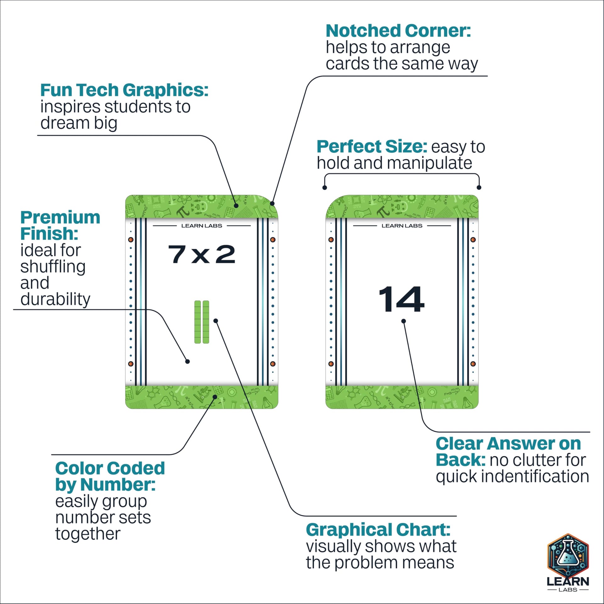 Details: Learn Labs flash cards were thoughtfully designed with students in mind. Learning the times tables is a critical step toward gaining confidence and proficiency in math, not just for school but for a lifetime of achievement in virtually all career paths. Our cards have simple features to help them stand above the rest. Primarily, we don’t combine more than one problem onto one card. This helps students separate the problems into groups they still need to practice. Second, we made our cards a standard playing card size, making them much smaller than most multiplication flash cards. This helps students hold and manipulate them quickly and easily. And lastly, we notched one of the corners to help students quickly identify any cards that aren’t facing the right way. This will help them spend less time shuffling and sorting, and more time learning. We’re confident you’ll love these flash cards!