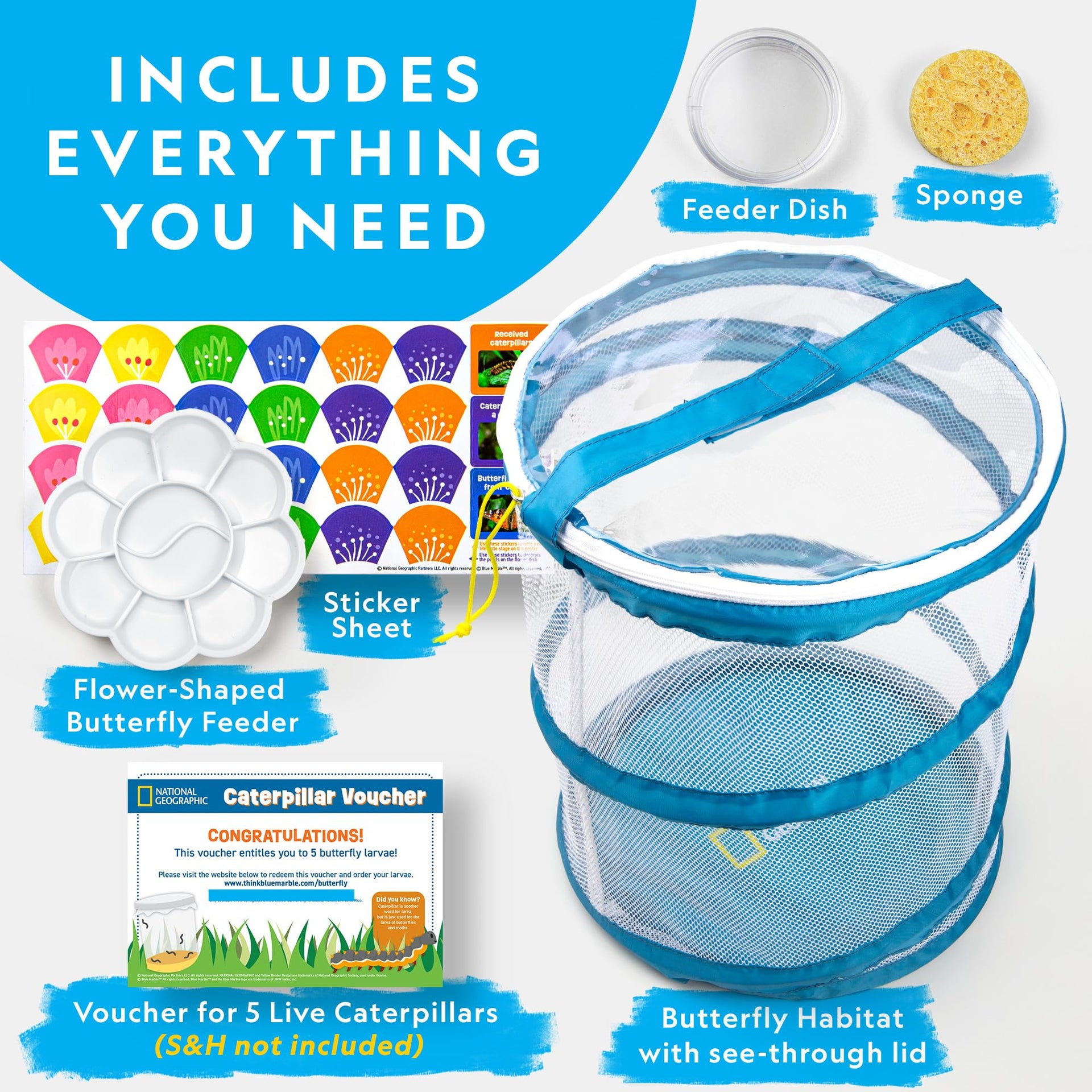 - LEARN ABOUT BUTTERFLIES - With National Geographic, learning is always part of the fun! The full-color Learning Guide in this kit teaches kids all about the butterfly life cycle, with a poster for documenting their own caterpillars' progress!