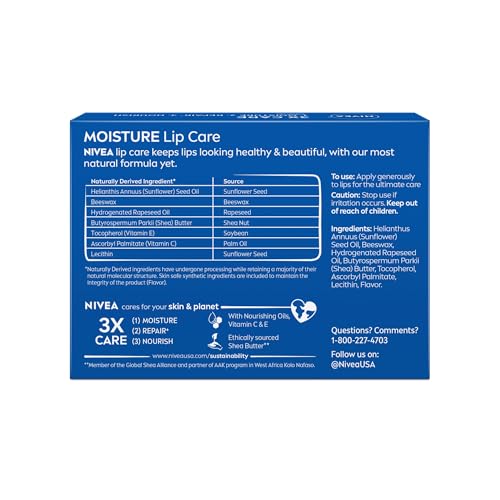 Details: NIVEA Moisture Lip Care is formulated to keep lips looking healthy and beautiful while providing them with long-lasting moisture. NIVEA Moisture Lip Care lip moisturizer is enriched with ethically sourced Shea Butter*, Nourishing Oils, Vitamin C and Vitamin E, and helps moisturize, soothe and nourish dry lips. This moisturizing lip balm promotes healthy-looking lips and leaves them feeling super soft and looking smooth. NIVEA Moisture Lip Care cares for your lips and the planet with a formula made of 99.5% naturally derived ingredients.** Keep this stick of NIVEA lip balm in your desk, pocket, purse or car for healthy-looking, soft lips at a moment's notice. Apply this hydrating lip balm to lips throughout the day for the ultimate lip care. From the World's No. 1 Lip Care Company.*** *Member of the Global Shea Alliance and Partner of AAK program in West Africa Kolo Nafaso. **Naturally Derived Ingredients have undergone processing while retaining a majority of their natural molecular structure. 0.5% skin safe synthetic ingredients are included to maintain the integrity of the product (Flavor) ***Euromonitor International Limited, Beauty and Personal Care 2024 edition, Beiersdorf AG, retail value RSP, 2023 data