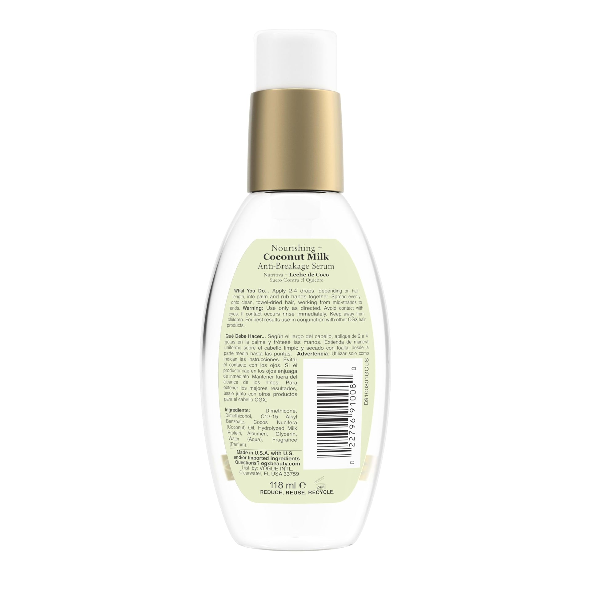 - TRANSPORT HAIR TO THE TROPICS: This 4-fluid ounce bottle of OGX Nourishing, Coconut Milk Anti-Breakage Hair Serum helps strengthen, repair and hydrate hair, leaving it looking glowing, healthy and beautiful with every use