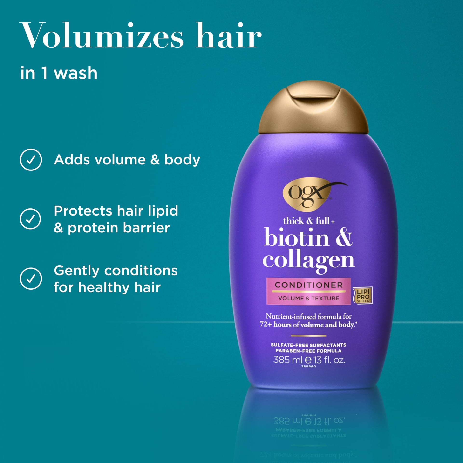 - VOLUME & TEXTURE: The 13-fluid ounce bottle of OGX Thick & Full + Biotin & Collagen Volumizing Conditioner with a nutrient-infused formula to give your hair 72+ hours of volume & body