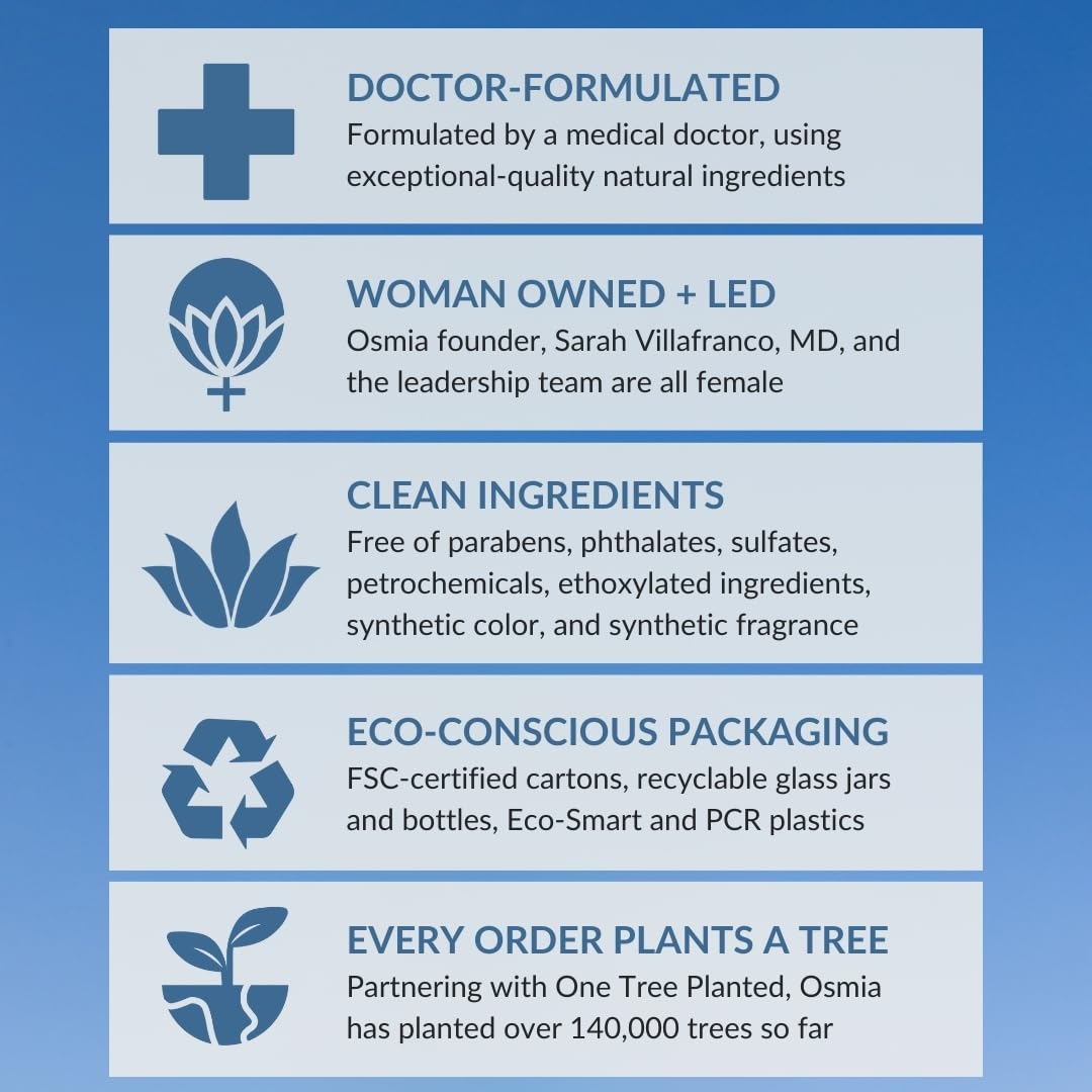 - All Osmia Products Are Made WITHOUT The Following Ingredients: Parabens, Phthalates, Sulfates, Petrochemicals, Ethoxylated Ingredients, Synthetic Color, + Synthetic Fragrance. Cruelty-Free.