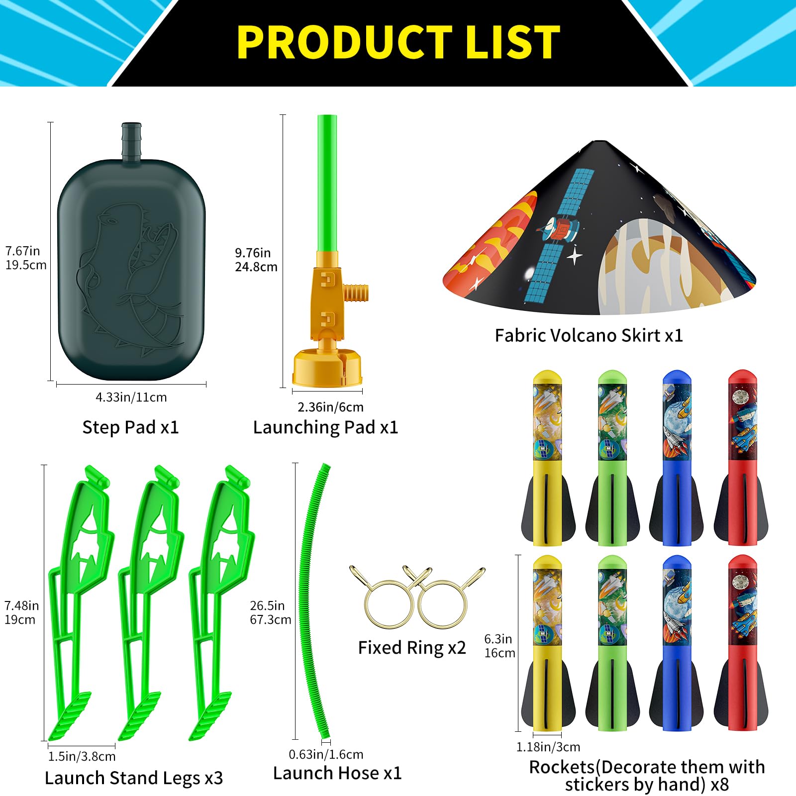 - Toy Rocket Launcher for Kids: Our rocket launcher set includes 8 multi-color foam rockets, 8 cartoon stickers, launch pad, and adjustable rocket launch stand with air hose. For children aged 3 years and above