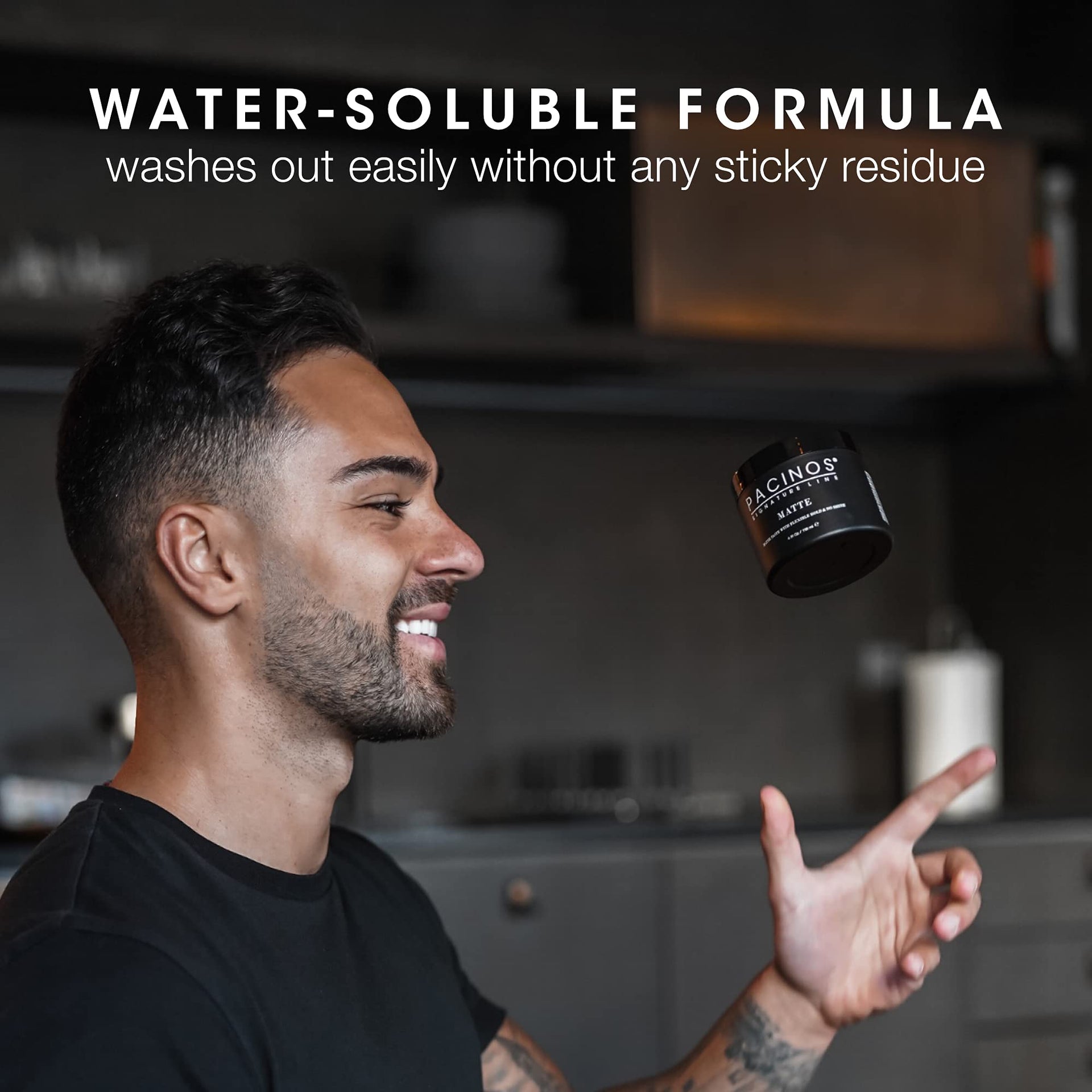 - ALL-DAY HOLD: With a quality MEDIUM-FIRM HOLD, Pacinos Matte is up to the task of holding shape. Apply to damp or towel dry hair. No flakes like a pomade, no clumping like a clay.