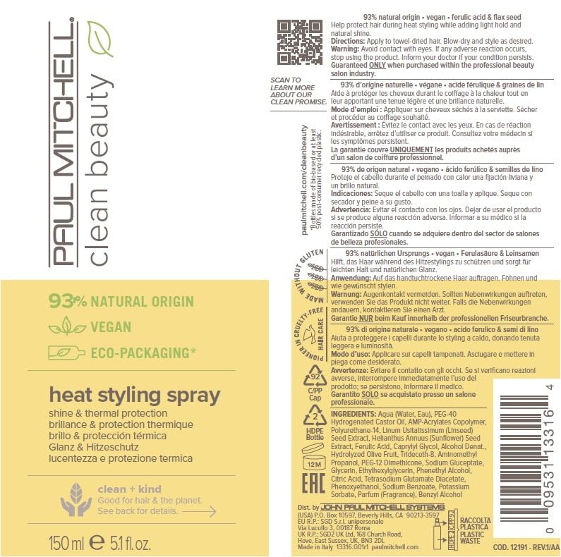 Clean Beauty Heat Styling Spray from Paul Mitchell helps protect hair during heat styling while adding light hold and natural shine. Infused with flax seed and ferulic acid to nourish and shield fragile strands, it’s the perfect blow-dry prep for polished styles with movement and flexible control.