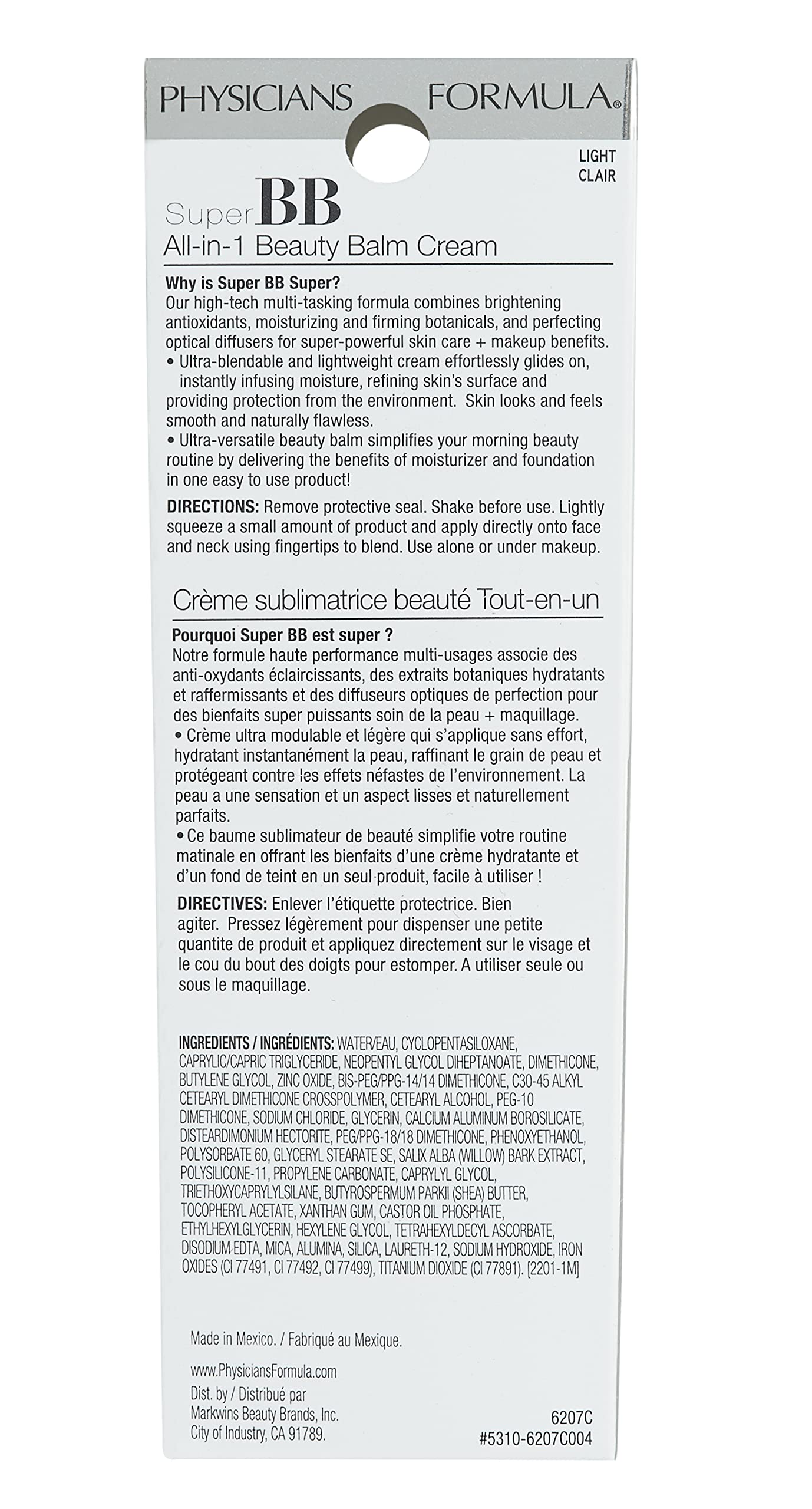 Physicians Formula Super BB Cream. All in 1 Tinted Beauty Balm Foundation Cream, Sheer Moisturizing Coverage, Cruelty free - Light