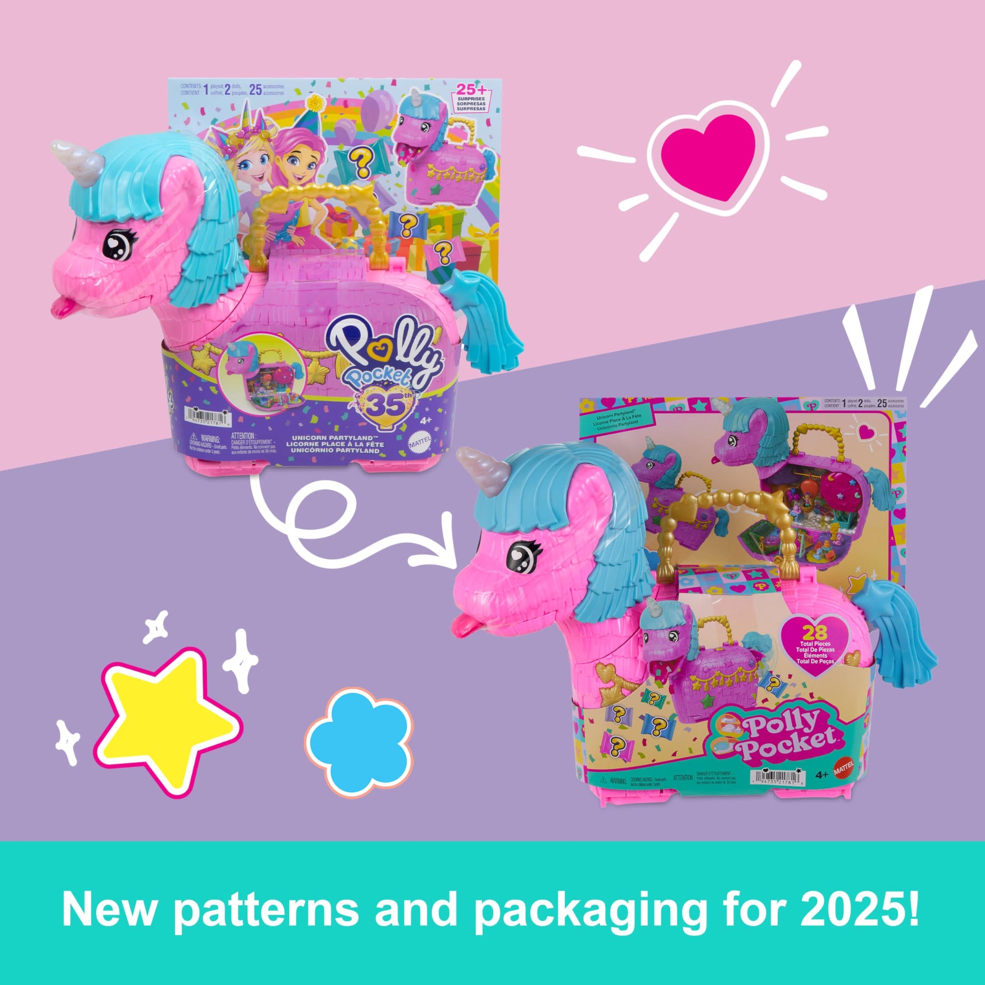 - This Polly Pocket Unicorn Partyland playset is full of festive fun! Everyone's invited to celebrate Polly's 35th anniversary with 2 micro dolls and 25 accessories, including pets.