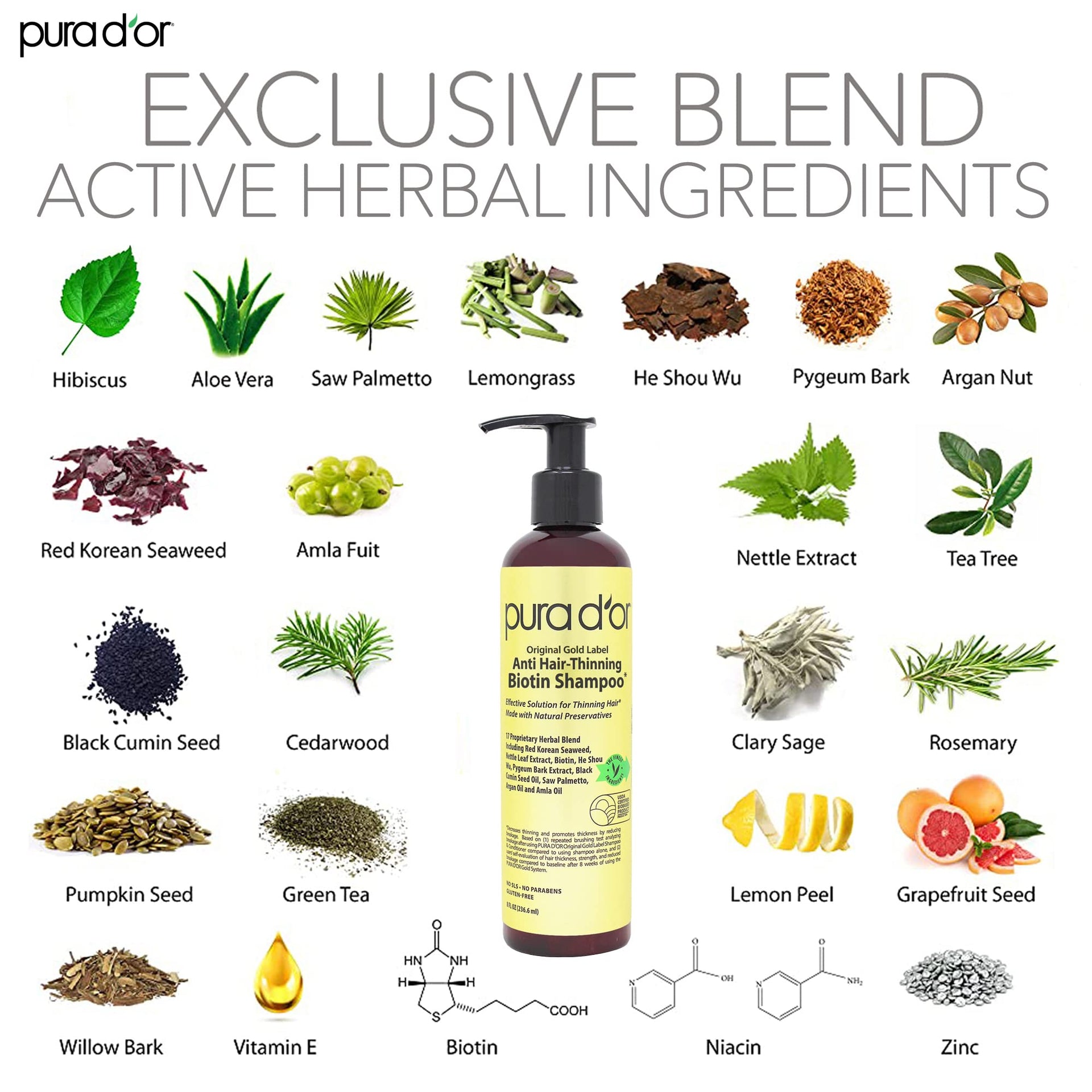 Details: PURA D'OR Original Gold Label Anti-Hair Thinning Shampoo is formulated with 17 Top Rated Key Active Ingredients that promote stronger, cleaner, healthier hair. Hand selected botanical ingredients, such as Organic Argan Oil, Red Korean Seaweed, Saw Palmetto, He Shou Wu and Nettle Extracts, add shine and help strengthen hair by increasing thickness while reducing the appearance of hair thinning and breakage. Our shampoo is gentle, especially for those with a sensitive scalp or even treated hair because it contains natural preservatives. All PURA D’OR products are cruelty-free and made without any parabens or sulfates. PURA D'OR is produced and bottled in a renewable energy source facility in Southern California.