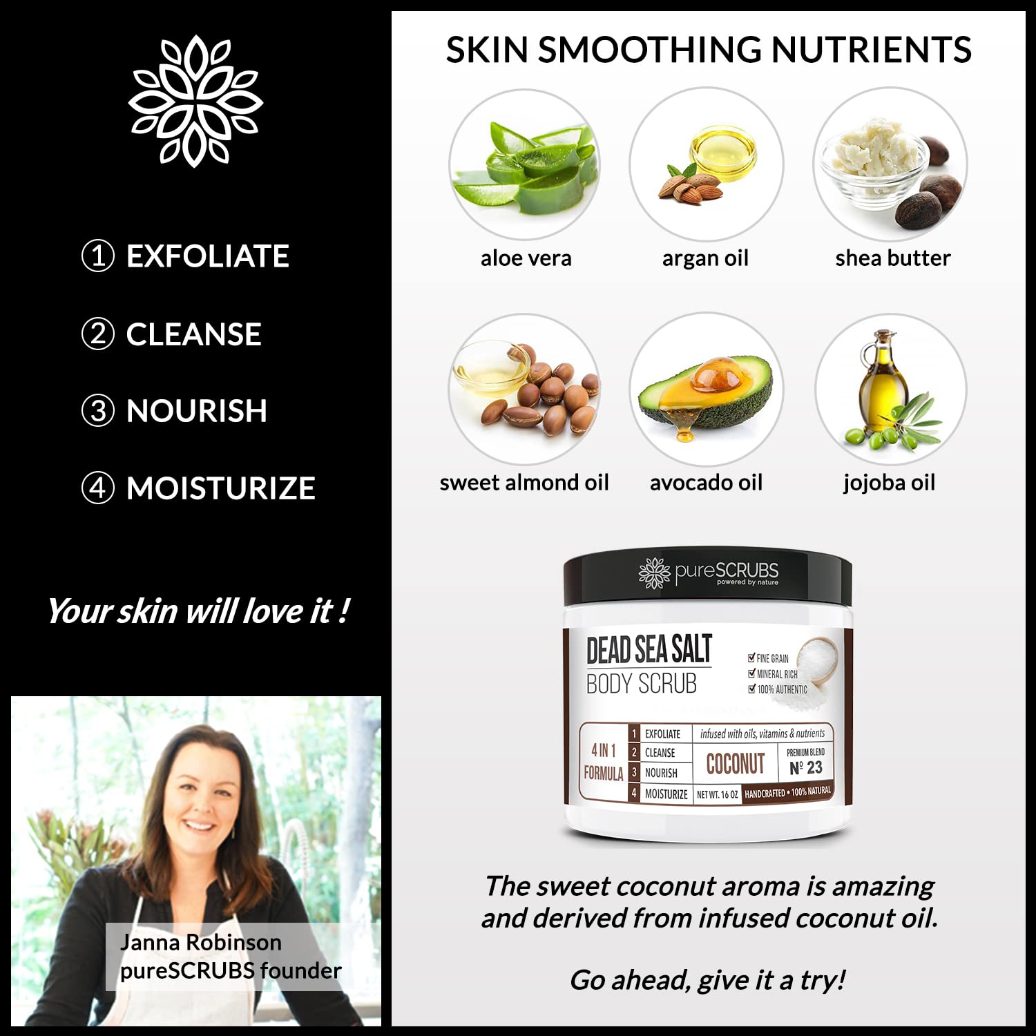 - GET ULTRA SMOOTH SKIN FAST - THIS WORKS! Our unique “4 in 1 Formula” does everything a body scrub should do and more - EXFOLIATE, CLEANSE, NOURISH & MOISTURIZE. Fine grain dead sea salt infused with essential oils, nutrients and skin softeners helps to smooth away rough, bumpy, and uneven textures to instantly reveal your true soft, healthy and radiant skin. You'll love the coconut aroma!