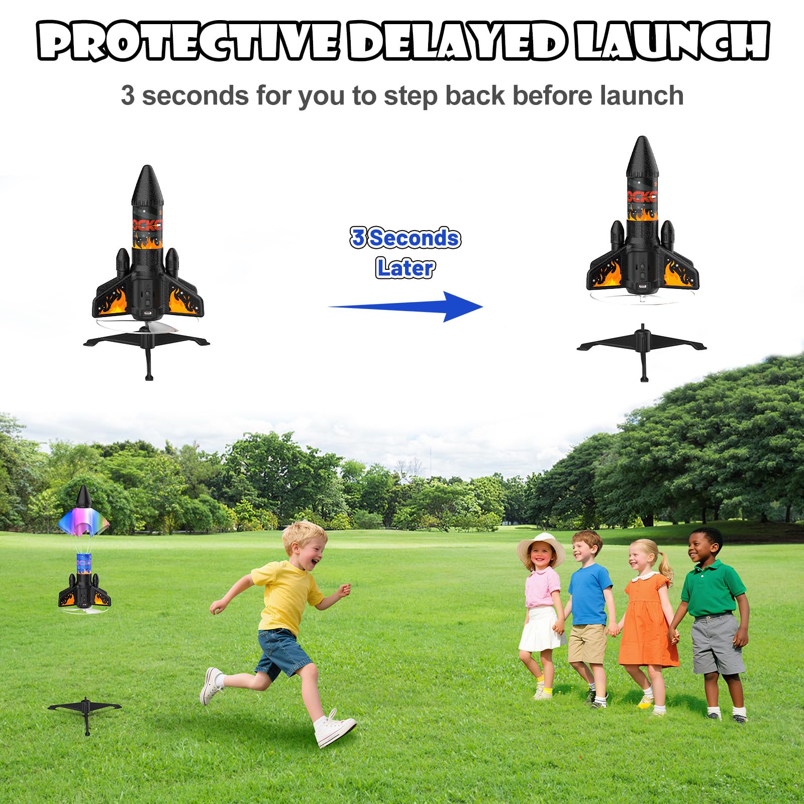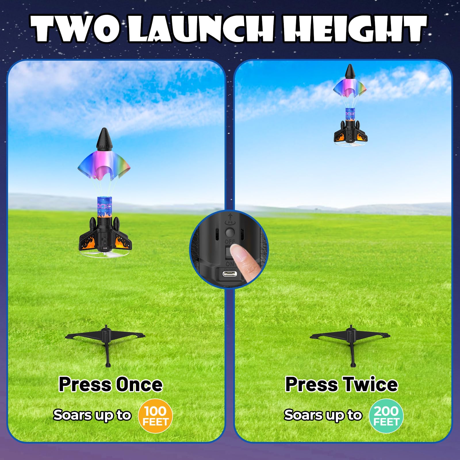 - 2 Launch Heights: Two flight modes let young explorers customize their launch: Press the launch button once for a 100 ft ascent (4s flight time), or press twice quickly to soar up to 200 ft (8s flight time). Ideal for open fields and soccer pitches
