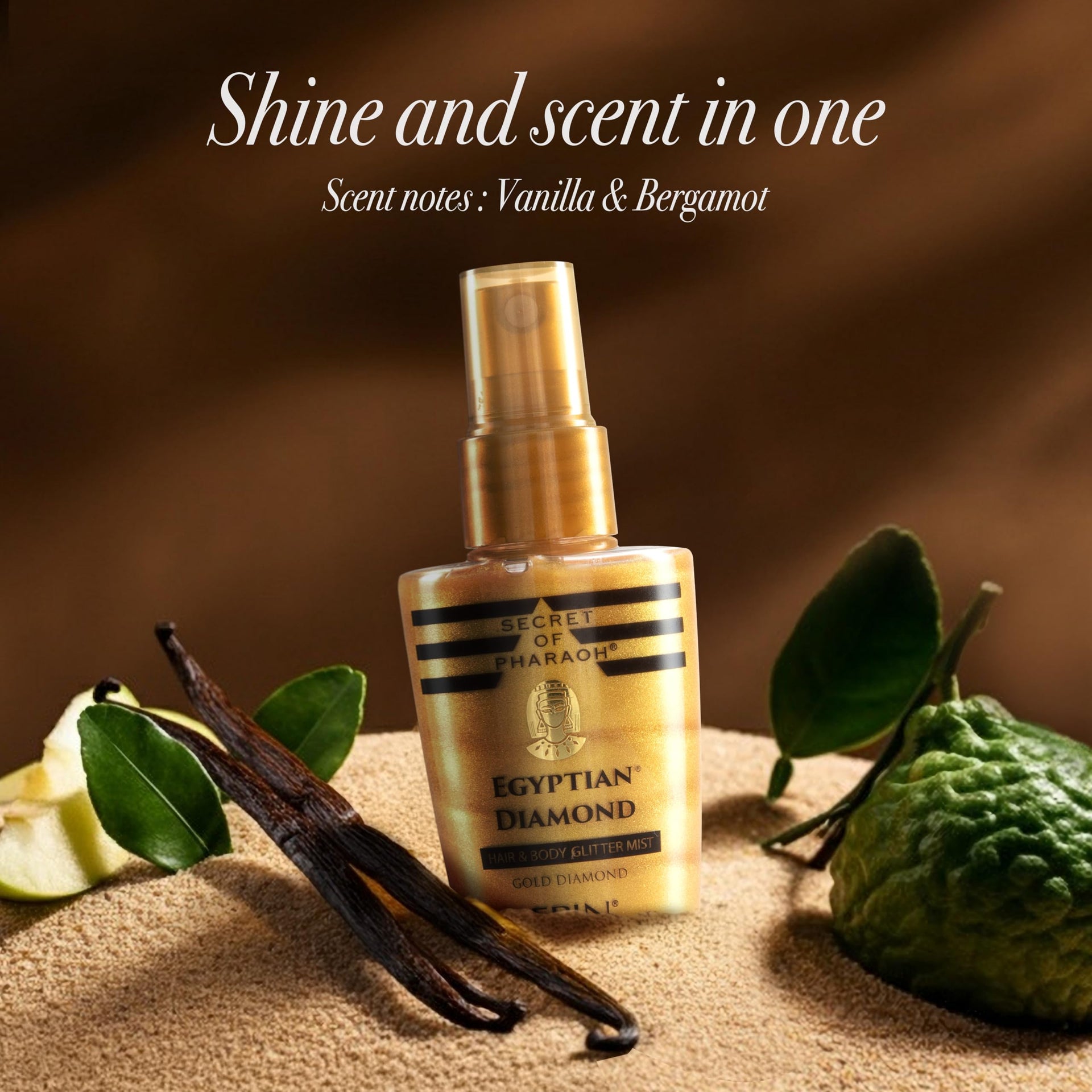 - [Luxurious Scent] Infused with the warm, captivating aroma of bergamot and vanilla, Egyptian Diamond Glitter Mist doubles as a fragrance, leaving a fresh, elegant scent. Shine bright and smell divine with this irresistible blend.