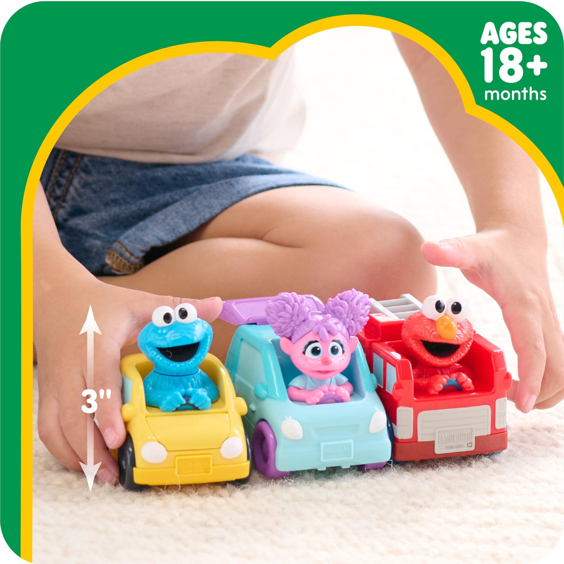 Details: Twist, Pop, and Roll with Sesame Street friends! Sesame Street Twist and Pop Wheelies vehicles feature favorite Sesame Street characters and exciting pop-up action. This Amazon Exclusive 3-piece set includes Cookie Monster in a taxicab, Elmo in a fire truck, and Abby Cadabby in a car. These 3-inch toy vehicles for toddlers have free-rolling wheels, so kids can push them around for imaginative vehicle play. Each comes with a Sesame Street character built-into the driver's seat. Turn its head for a fun, pop-up surprise! See Cookie Monster's hood pop open, Elmo's fire truck ladder pop up, or Abby's trunk open to reveal groceries. Built for little hands and big fun, kids will love rolling into adventures with this Amazon Exclusive Sesame Street preschool toy. For children ages 2 years and up. Sesame Street and associated characters, trademarks, and design elements are owned and licensed by Sesame Workshop.