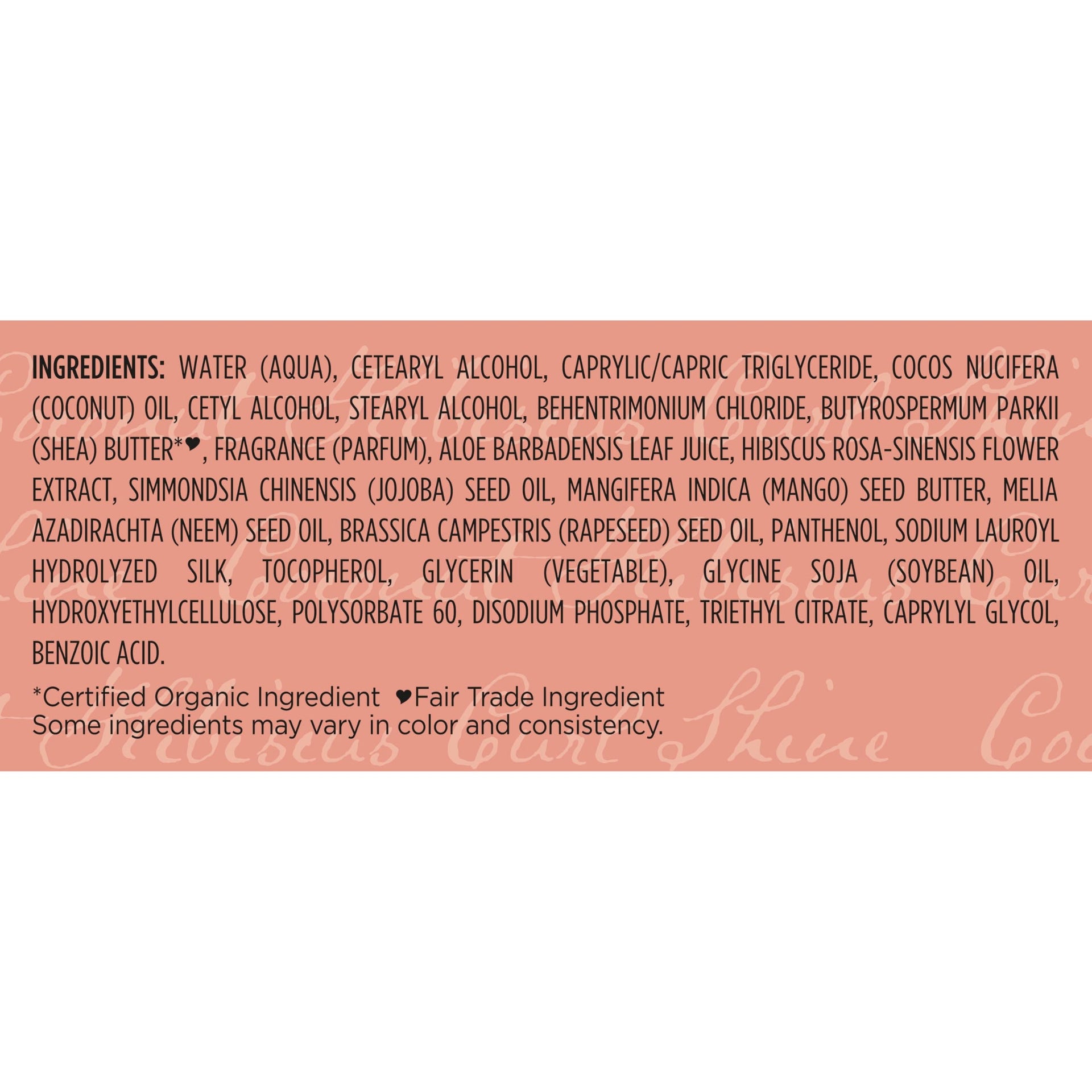 - All SheaMoisture hair products, like this Coconut & Hibiscus Conditioner, are made with fair trade shea butter and contain no silicones, no sulfates, no parabens, no phthalates, no mineral oil and no petrolatum