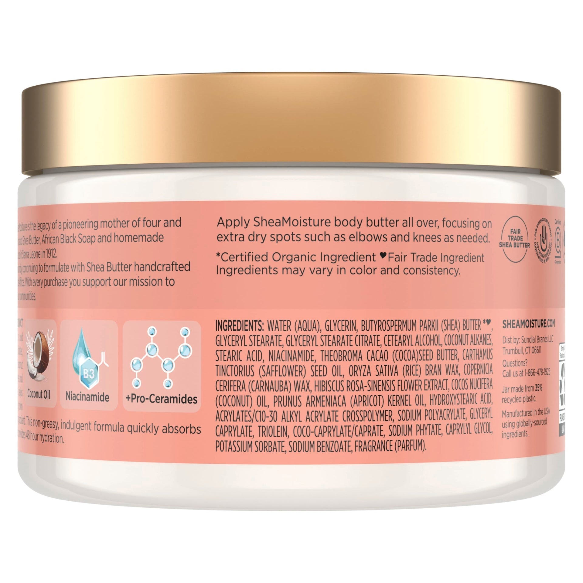Details: We created SheaMoisture Coconut & Hibiscus Illuminating body butter to bring you an elevated self-care experience with its velvety smooth consistency that won’t leave a white residue. So, when you’re searching for the best body butter for renewing dull, dry skin, we’re here for you! Our ultra-rich and creamy body butter, blended with coconut oil, niacinamide + Pro-Ceramides, helps to replenish dry skin and leave it glowing. This non-greasy, indulgent formula quickly absorbs into the skin and provides 48-hour hydration, which is ideal for those trouble spots that tend to get extra dry, like knees, elbows, and heals. SheaMoisture Illuminating body lotion is dermatologist-tested skincare and infused with rich ingredients that provide long-lasting moisture and restorative results. Pamper yourself and renew your skin's natural glow with a formula that's free of parabens, phthalates, petrolatum, and mineral oil. You’ll notice the impressive skin care benefits immediately! OUR STORY: SheaMoisture is the legacy of a pioneering mother of four and entrepreneur, who sold Shea Butter, African Black Soap, and homemade beauty preparations in Sierra Leone in 1912. We honor her vision by continuing to formulate with Shea Butter handcrafted by women in West Africa. We’re powered by purpose at SheaMoisture because with every purchase, you support our mission to reinvest in and serve Black communities (in the US and around the world).