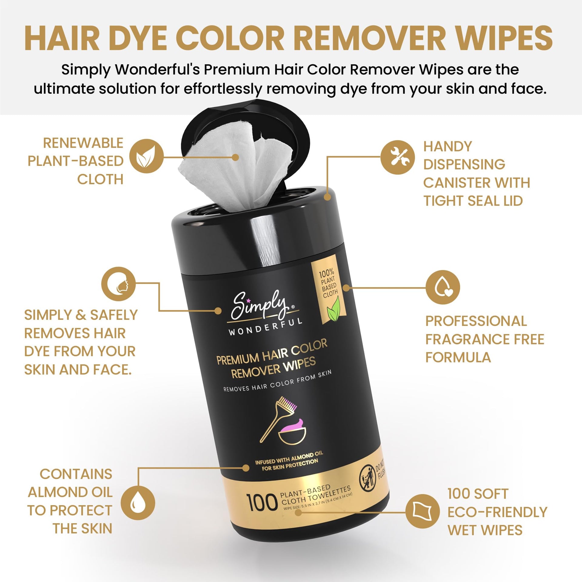 - Simply Wonderful Premium Hair Color Remover for Skin is a 100-count non-irritating plant-based wipe infused with almond oil, designed to easily remove hair color stains from your face and skin.
