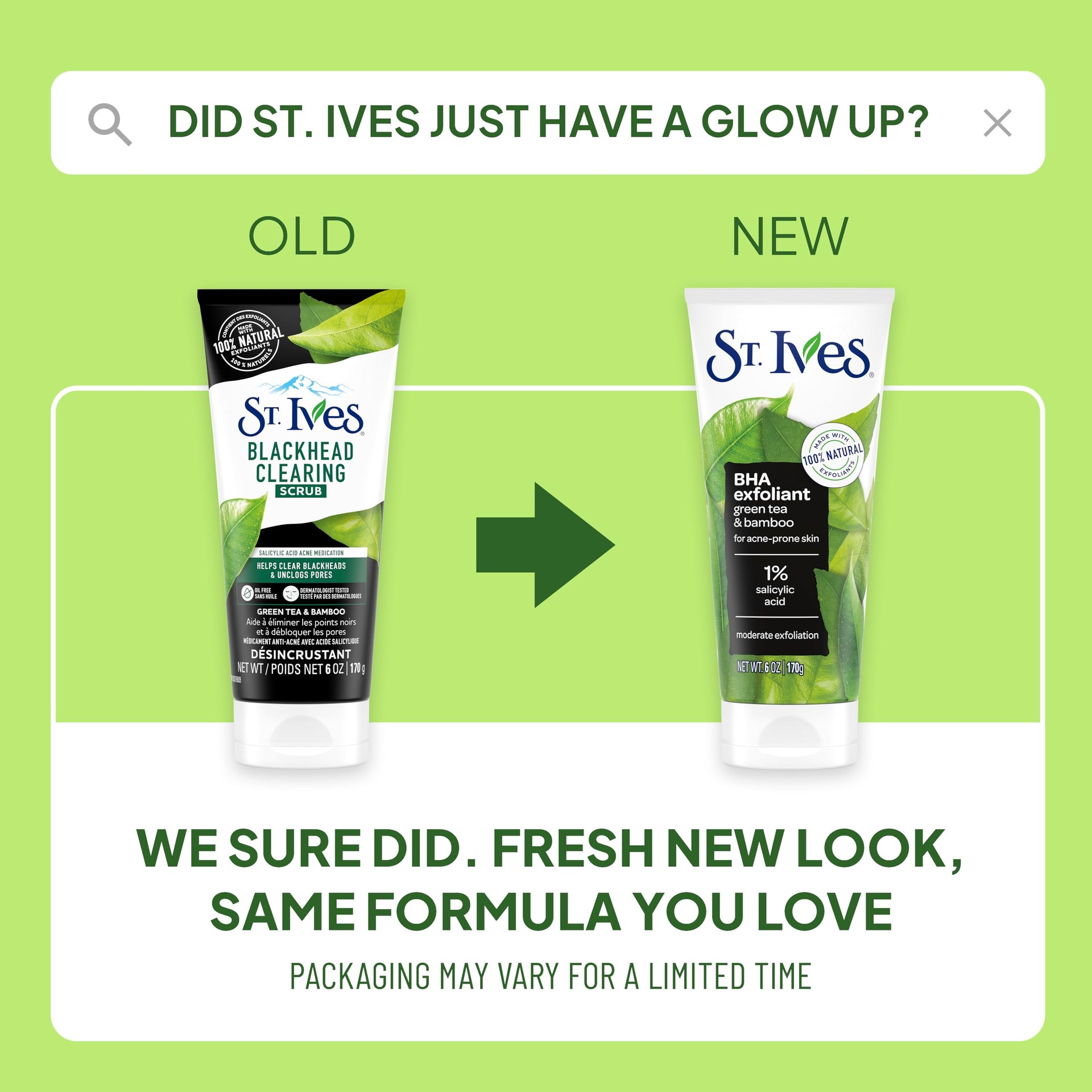 Details: Problem skin has met its match! St. Ives Green Tea Blackhead Clearing Face Scrub exfoliates for a more even skin tone and smooth, glowing skin. From America’s No. 1 face scrub brand*, this face scrub helps unclog pores and contains 1% salicylic acid, which helps to clear blackheads and acne and calm redness. Our Green Tea Blackhead Clearing face scrub is made with 100% natural exfoliants (walnut shell powder and bamboo powder) to provide a moderate level of exfoliation. St. Ives' walnuts are grown in orchards in California and harvested in the fall where the shells are finely milled and polished, so each particle only exfoliates the outer layers of dead skin cells. Our green tea leaves come from China and are processed in the traditional Chinese way. This involves heating them to stop oxidation, so they stay that lovely vibrant green color. The salicylic acid in this scrub can also help tackle 'maskne' (acne caused by protective face masks). Adding this deep cleaning face scrub to your routine along with replacing and washing your protective masks frequently are some ways to help combat 'maskne.' This scrub is dermatologist tested, paraben free, non-comedogenic (not tending to cause blocked pores), and oil free. And it’s simple to use. Just squeeze a dime sized amount onto your fingertips and massage onto damp skin. Spread in small circular motions to wake your skin’s natural circulation. When you’re done, rinse and glow. For best results, use 3-4 times a week. St. Ives products are made with 100% natural moisturizers, exfoliants, and/or extracts to bring the joy of nature into our skin care products to give you soft, refreshed skin that glows. St. Ives does not test on animals anywhere in the world and is certified by PETA.