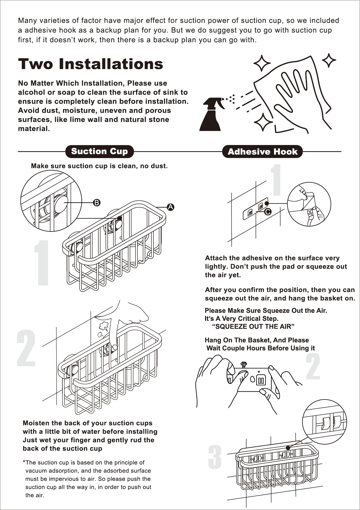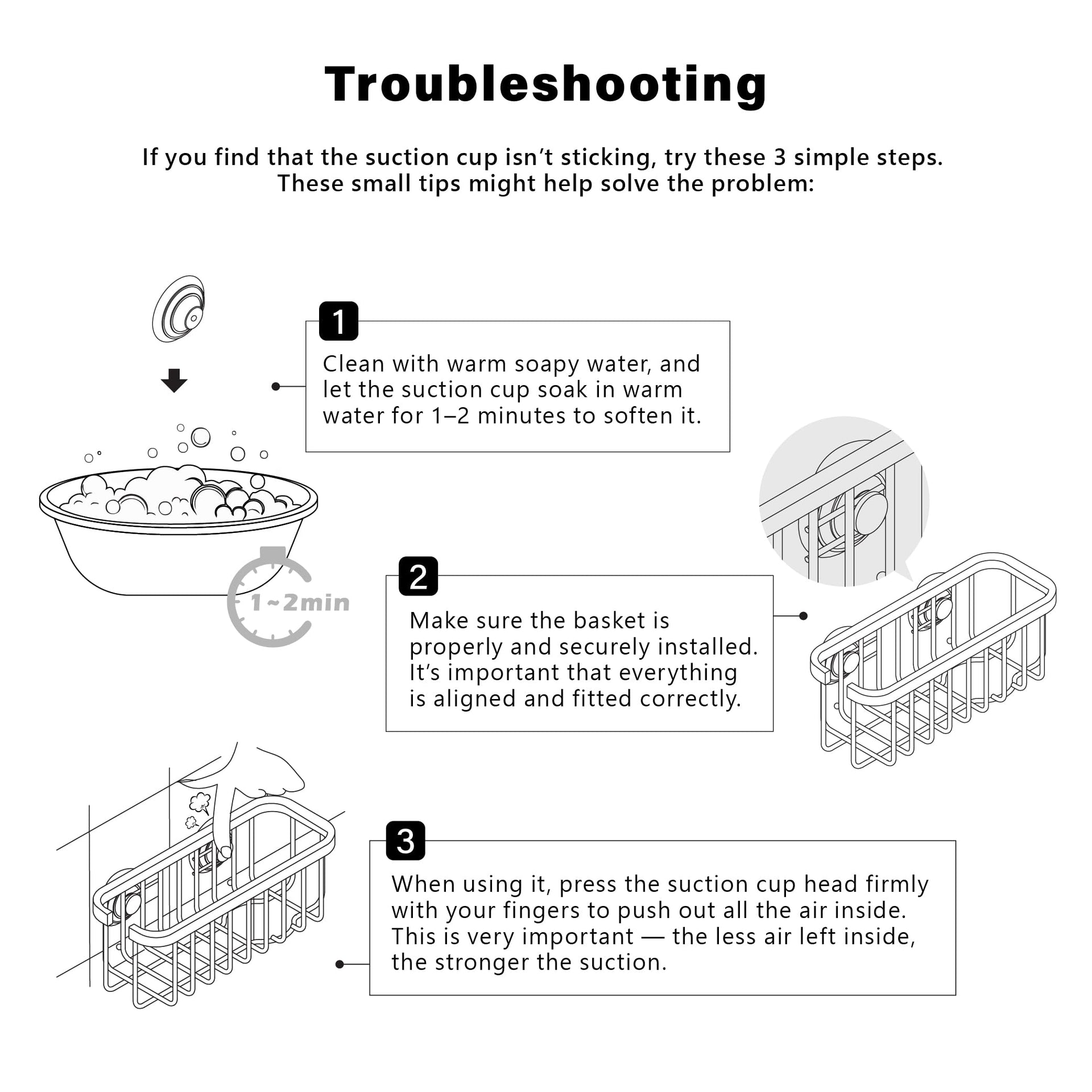 - If you find that the suction cup isn’t sticking, try these 3 simple steps. These small tips might help solve the problem: 1. Clean with warm soapy water, and let the suction cup soak in warm water for 1–2 minutes to soften it. 2. Make sure the basket is properly and securely installed. It’s important that everything is aligned and fitted correctly. 3. When using it, press the suction cup head firmly with your fingers to push out all the air inside. This is very important — the less air left inside, the stronger the suction. 4. Avoid corners, curved, or textured areas.
