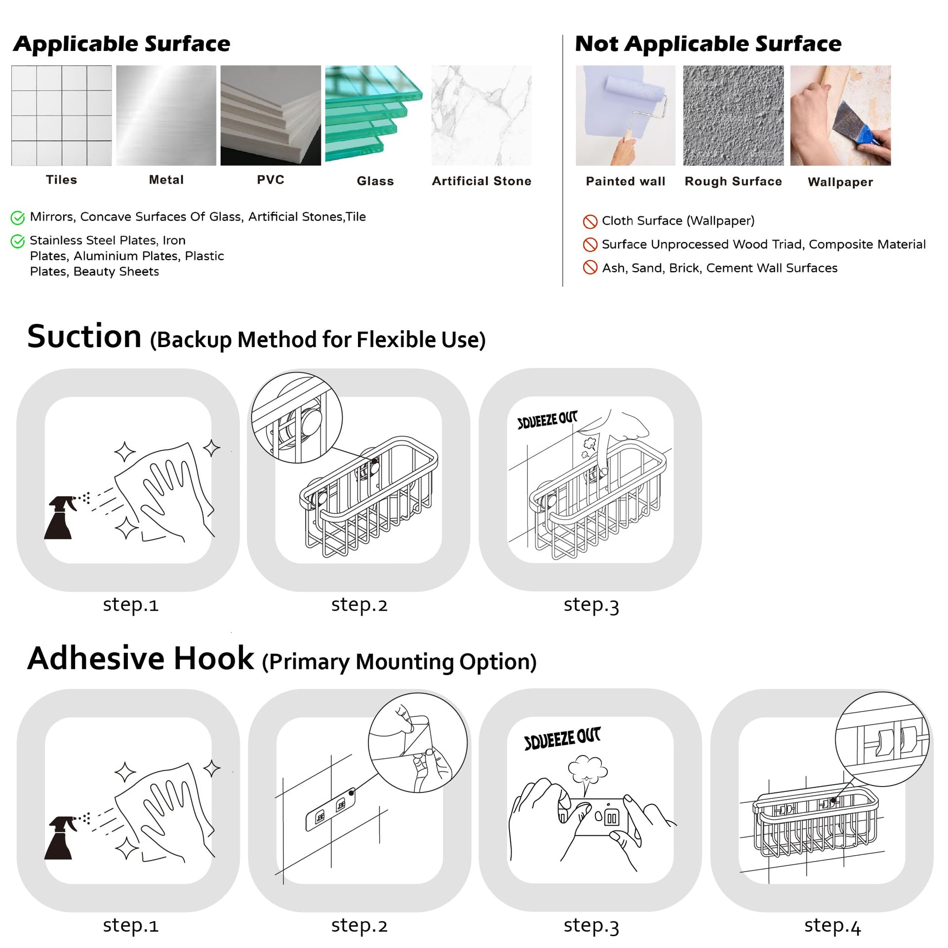 - Important Compatibility Notice: Suction cups are only effective on smooth, non-porous surfaces such as polished tile, stainless steel, or glass. Does NOT stick well to stone, cement, granite, Silgranit, marble, or textured surfaces. Use included adhesive pad for those surfaces.