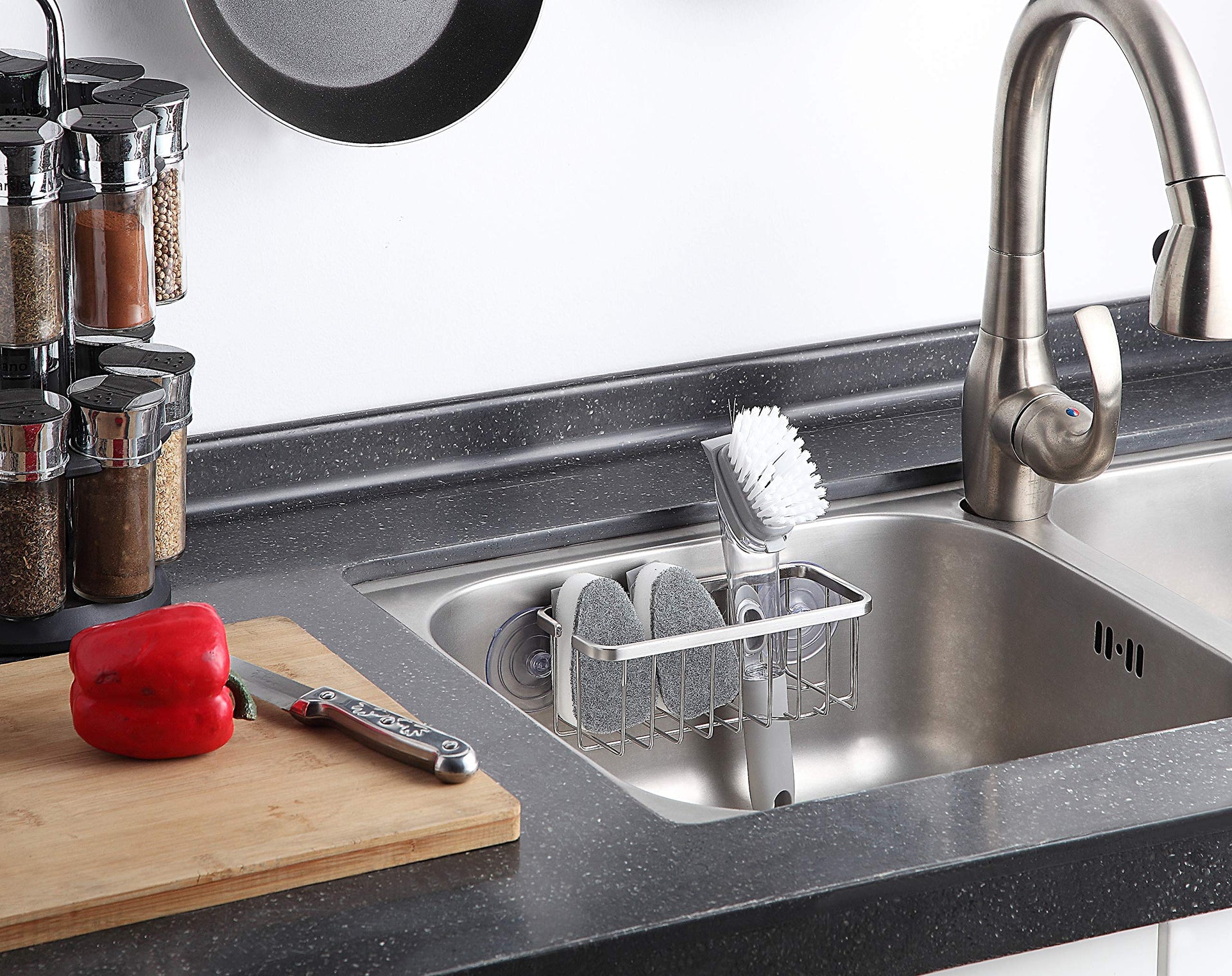 - Spacious Yet Compact Design – Offers more storage than standard sink caddies while maintaining a compact footprint. Holds multiple sponges, brushes, scouring pads, and drain stoppers with ease. Overall dimensions: 7.48" x 3.3" x 2.75". Important: This model is slightly larger than standard caddies—please confirm your sink depth can accommodate 3.3" height. The brush slot opening is approx. 2.2" x 2.2". Use a measuring tool (not visual estimation) to ensure your brush head fits.