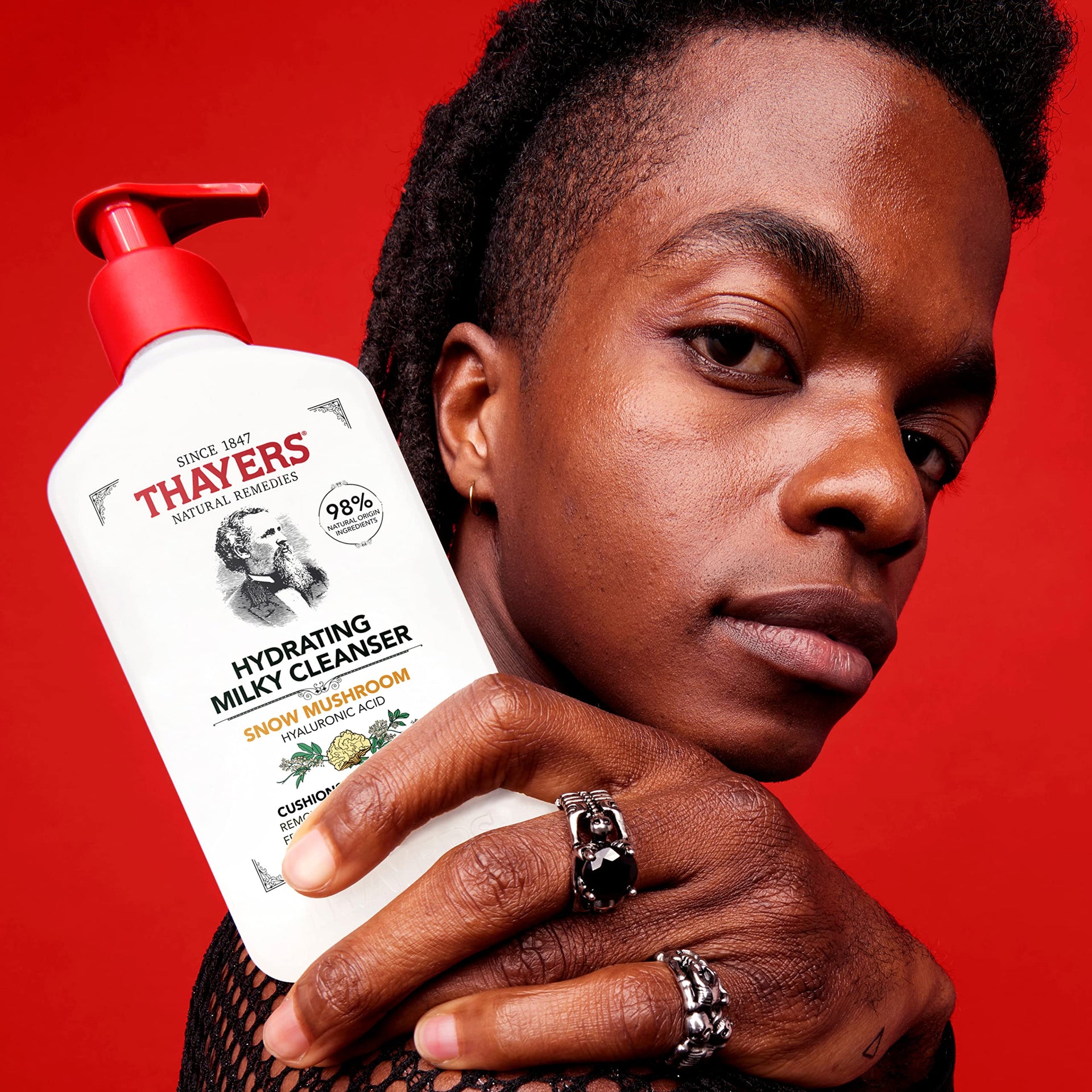 Details: Thayers Hydrating Milky Cleanser helps skin feel immediately hydrated and soothed while removing makeup and impurities. Skin texture feels smoother after 1 use. The gentle, milky formula, blended with snow mushroom, hyaluronic acid and elderflower water, cushions while cleansing to avoid disrupting the skin barrier, so skin does not feel stripped or dry. Thayers Milky Hydrating Cleanser is 100% cruelty-free and free of any animal ingredients, and we aim to reduce waste by offering recyclable packaging. Paraben, phthalate, oil and gluten-free. Non-Comedogenic. Thayers has committed to excellence with our formulas, featuring classic ingredients we've used for nearly two centuries. Thayers elixirs have been a fixture in medicine cabinets for generations, once you use them, you'll know why. Dermatologist Tested*, based on product safety test 2020.