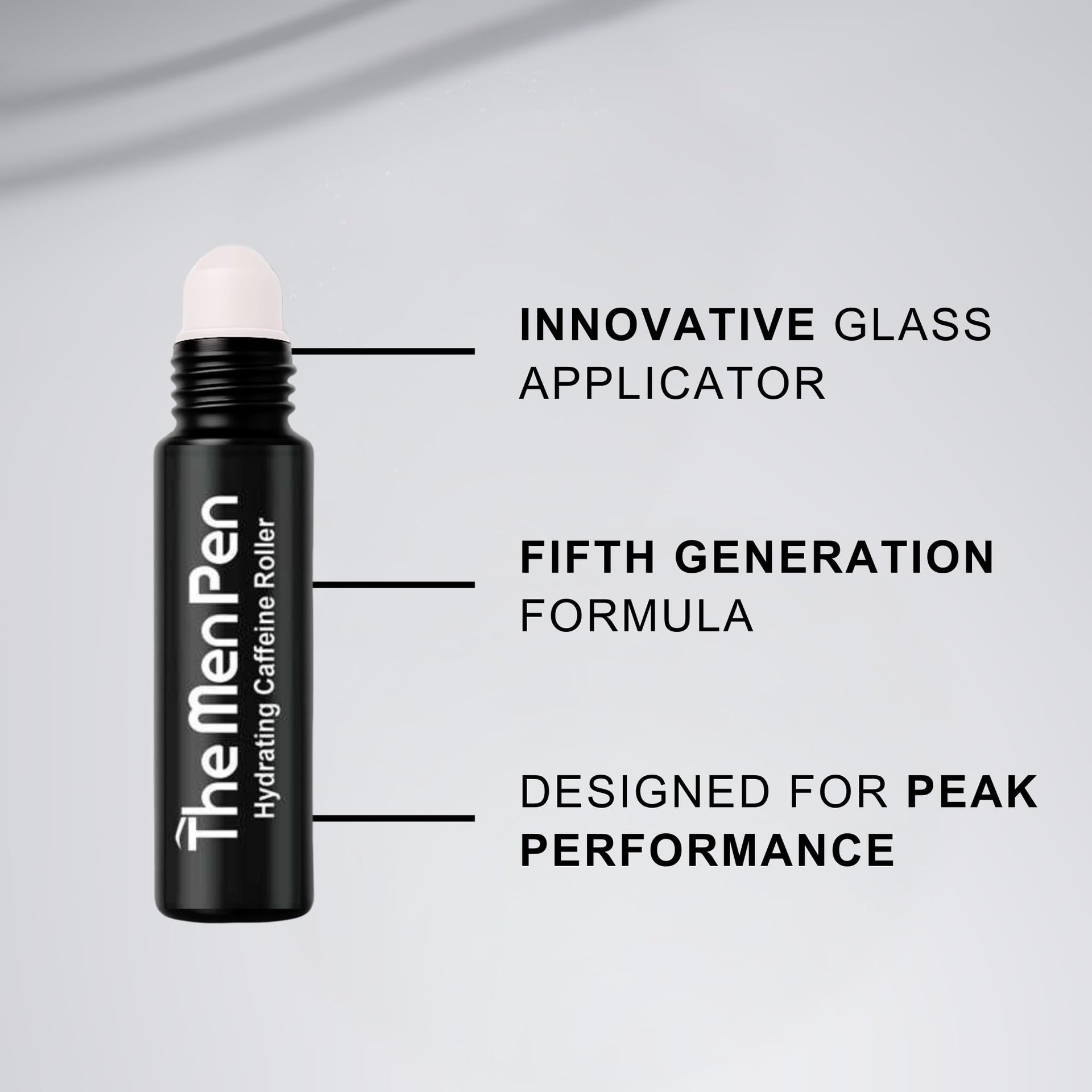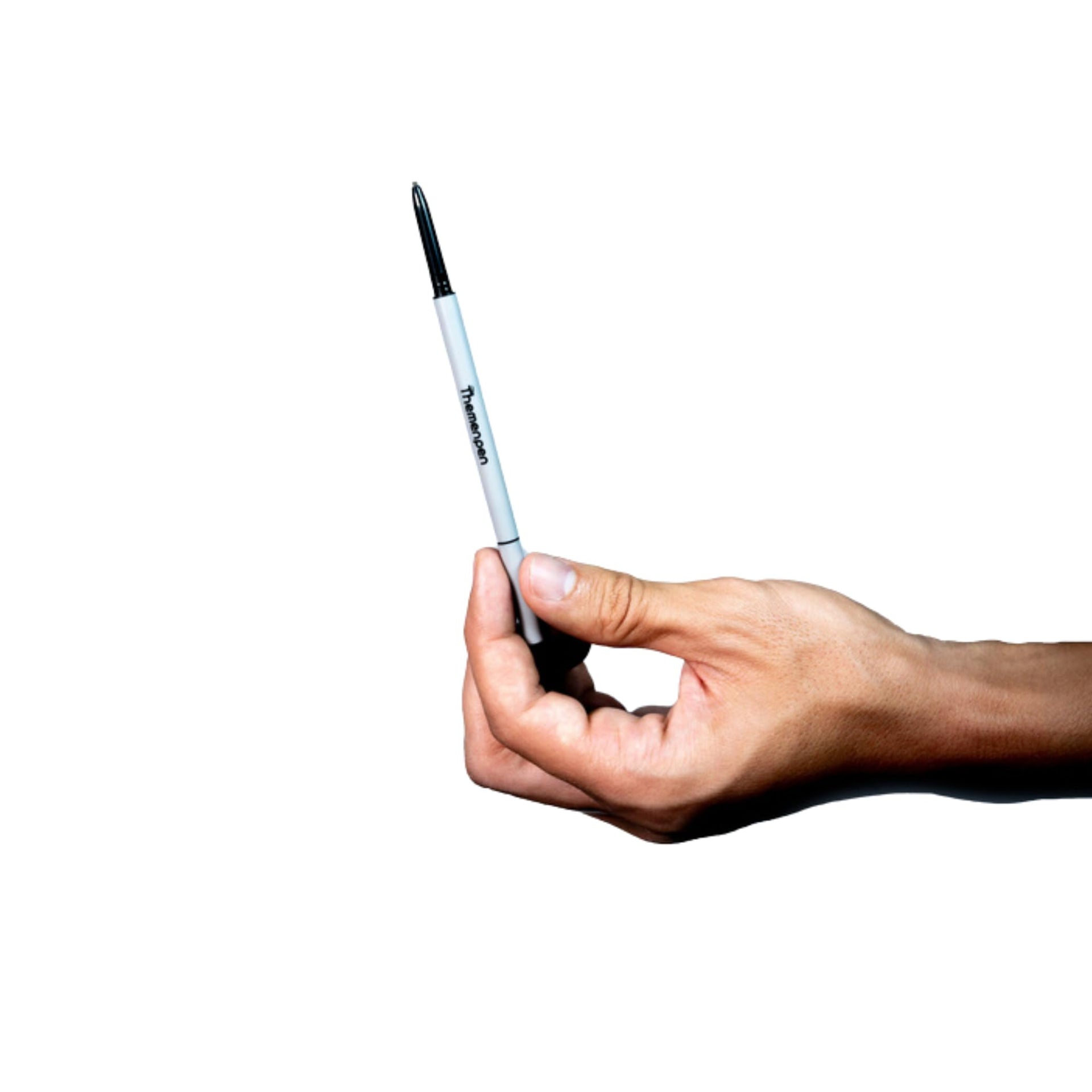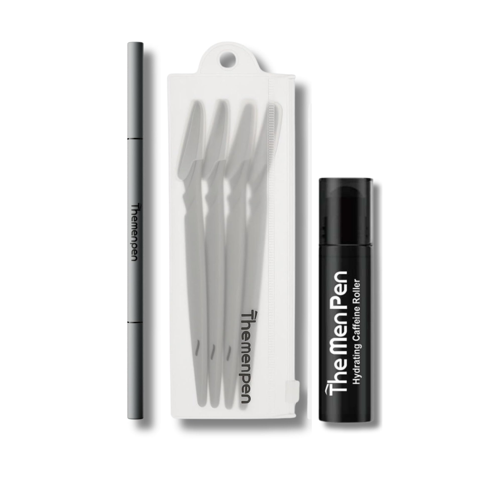 Men's grooming products including a pen, tweezers, and a roller on a white background.