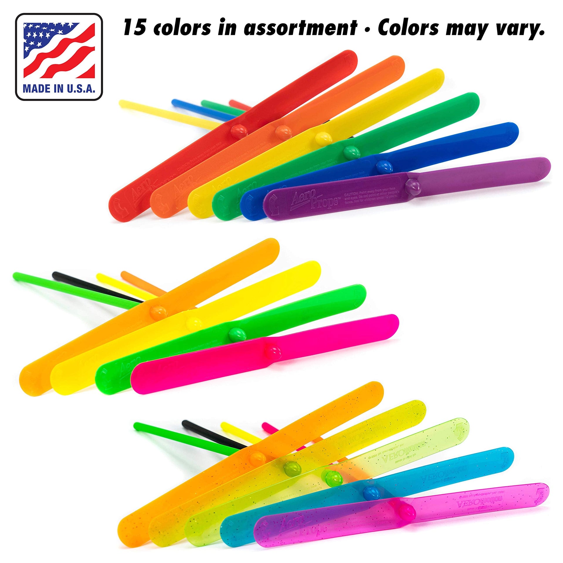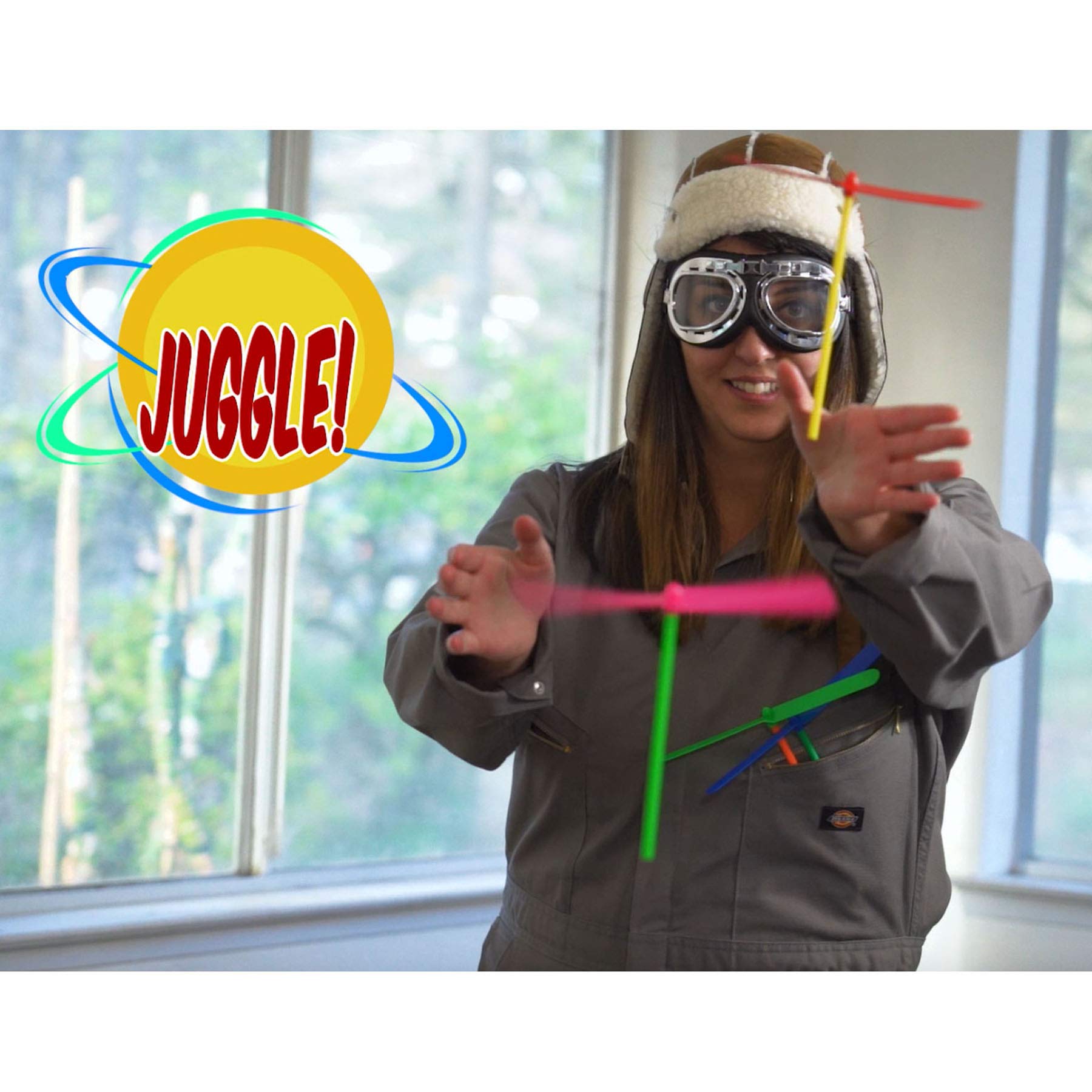 Details: Experience the thrill of flight from your living room or wherever else you may be with Aero Propsª! Once you begin flying, you won't be able to put it down. Aero Propsª are the original and best quality flying propeller toys available! Kids and adults alike can fly these straw propeller whirligigs up to 30 feet high and experience hours of endless fun! Fly by yourself, with a friend, play catch, make a target, juggle, do boomerangs, curve shots, and so much more. These spin flying toys are 100% Made in the USA since 1991 and engineered for optimum flight performance. Simply place the dowel between your hands, push your right hand forward while pulling your left hand back slightly, and watch it soar! Control your Aero Propsª by pointing the propeller in the direction you want it to fly. Aero Propsª come with educational flight instruction manuals that teach the basics of how to fly, complete trick shots, and go over the scientific principles of flight that make the toy fly freely! Scientific principles include AIRFOILS, MOMENTUM, INERTIA, MASS, PRESSURE, THRUST, LIFT, FRICTION & GRAVITY. Aero Props are the perfect interactive teaching helicopter spinner tool to teach the principles of flight while having fun. This pack of Aero Props comes with a 100% satisfaction guarantee. If you're not happy for any reason, please contact us and we will take gladly care of you. Happy flying!