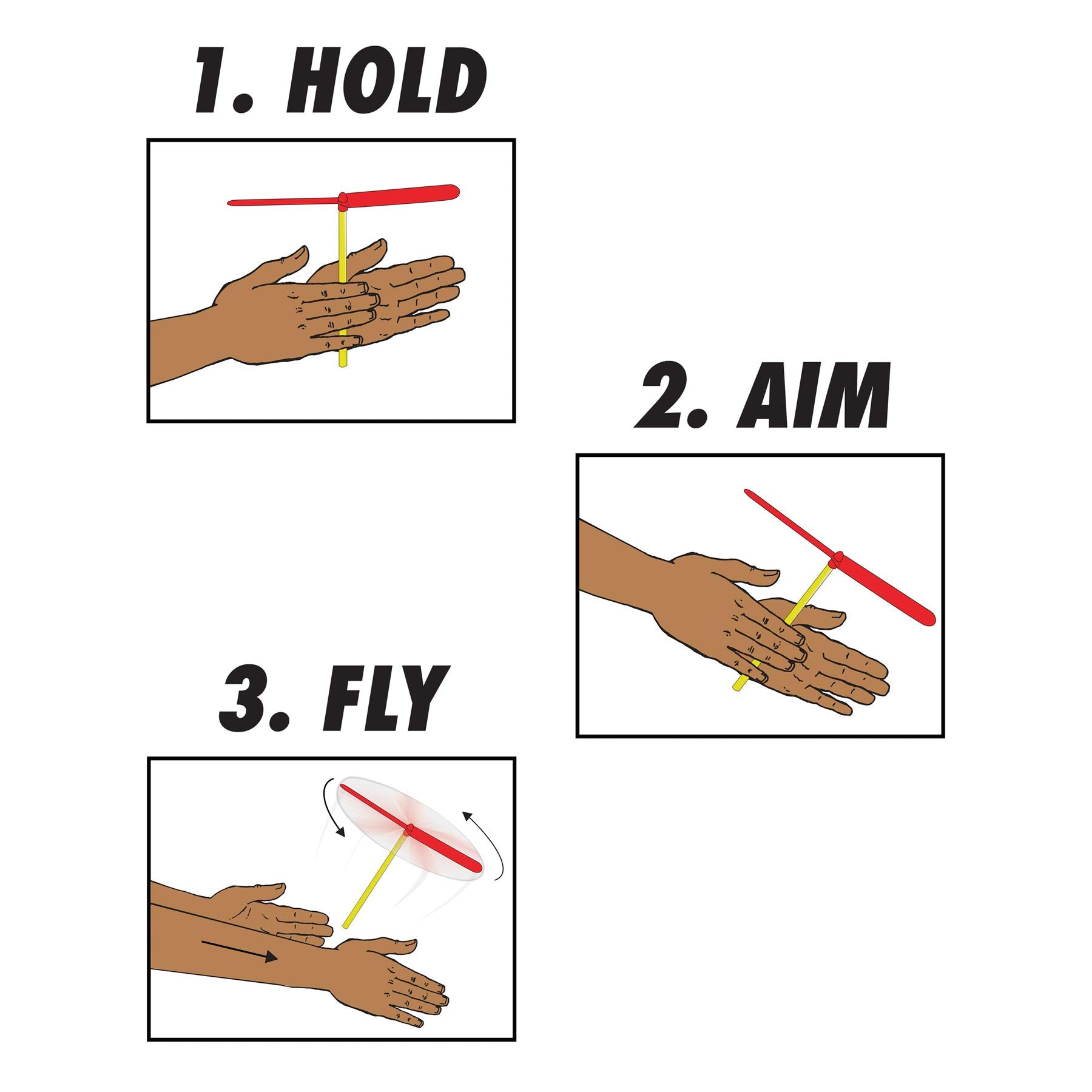 - FLY UP TO 30 FEET - Great for indoor or outdoor flight. Fly this plastic twirly whirly by yourself or with your friends. Simply place the dowel between your hands, push your right hand forward while pulling your left hand back slightly, and watch this propeller take off into the wild blue yonder! Play catch, juggle, show off with boomerang shots, make a target, complete impressive curve shots, and so much more
