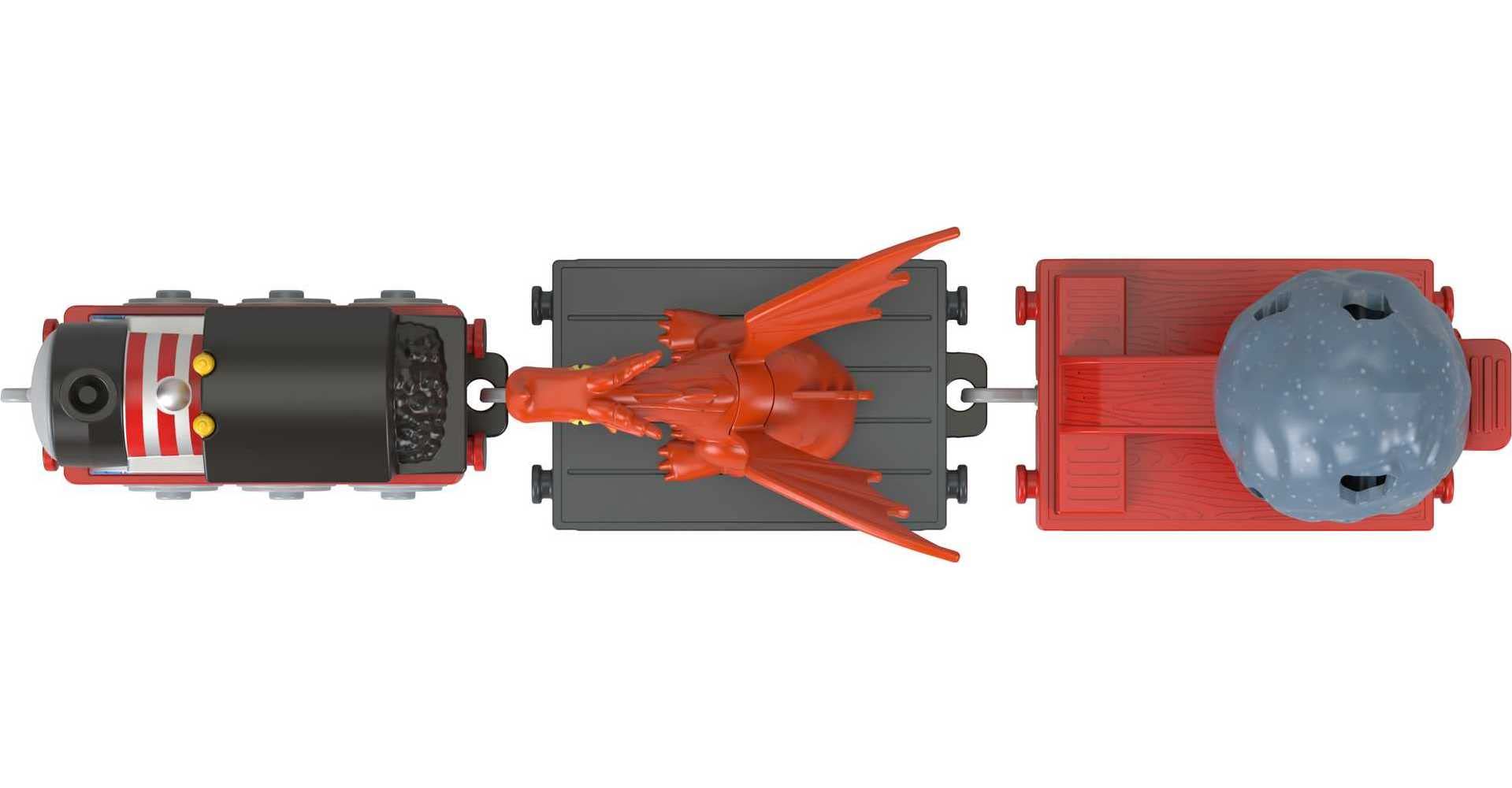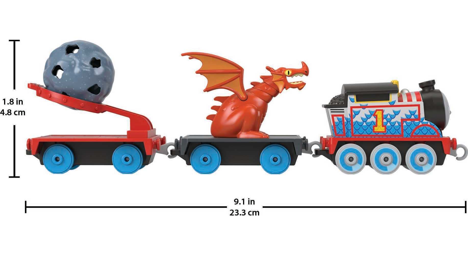 - Die-cast metal, push-along Thomas engine styled in medieval theme with boulder launcher and removable toy dragon
