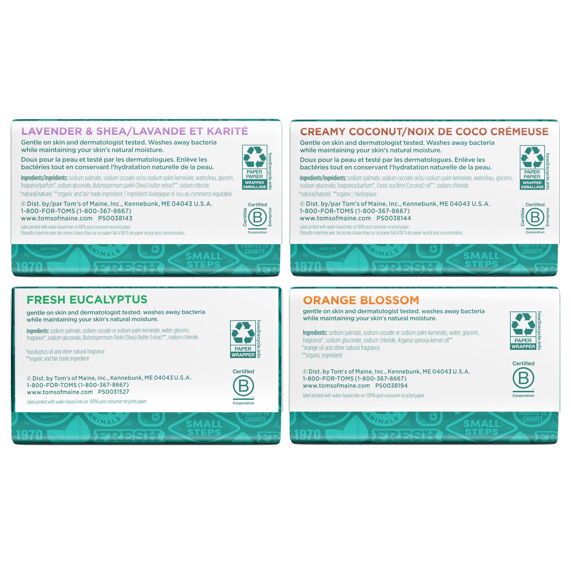 - WHAT’S INCLUDED: This 4-pack of Tom’s of Maine Bar Soap includes a variety of scents, including Lavender & Shea, Fresh Eucalyptus, Creamy Coconut, and Orange Blossom