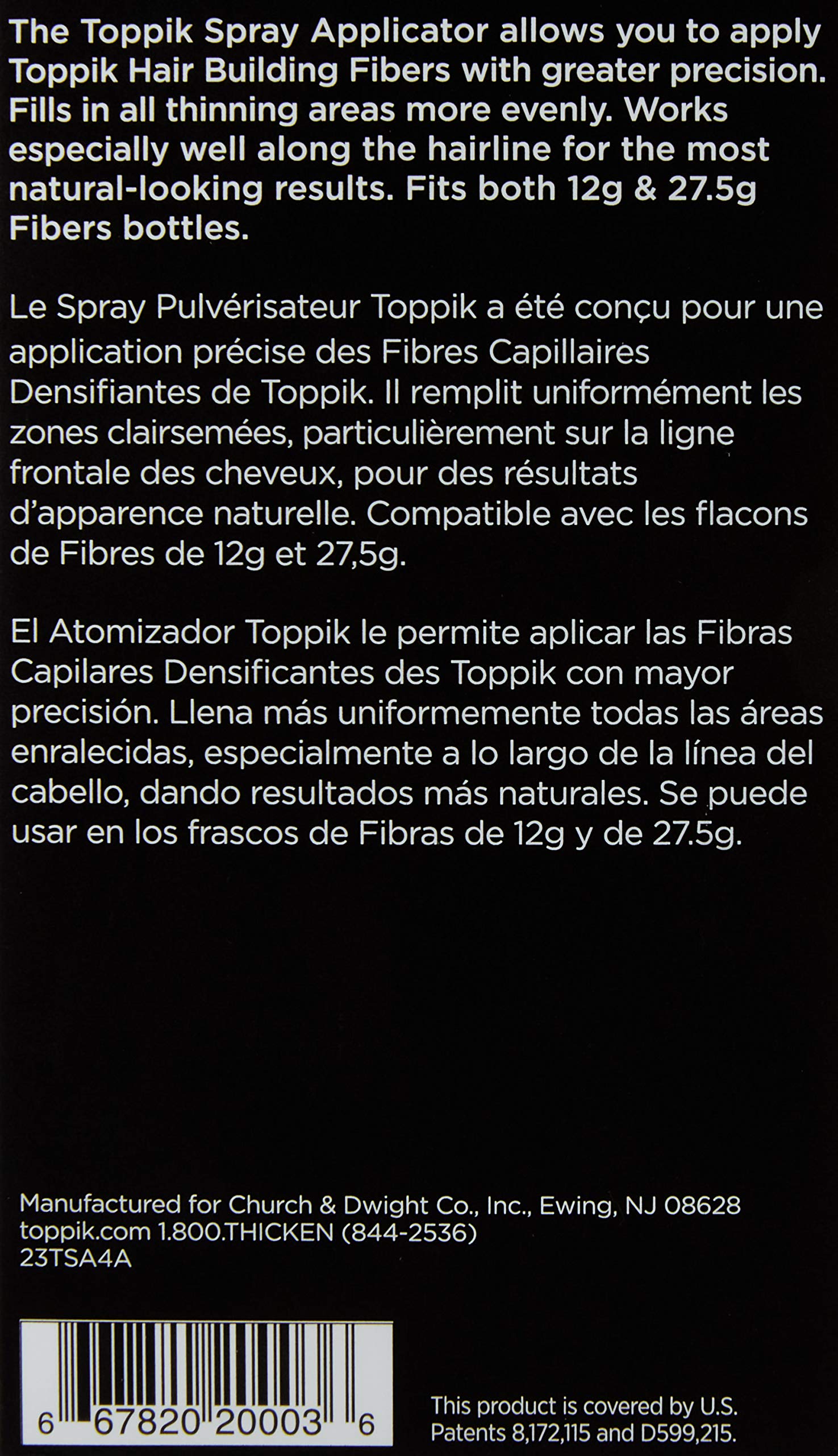Details: A patented tool that attaches to Regular and Economy size bottles of Toppik Hair Fibers. Allows you to easily target and spray Hair Fibers into specific areas. To use: Unscrew Hair Fibers cap. Twist and pull off sifter. Screw the Spray Applicator onto bottle. Press down on pump. Apply more or less pressure to control the amount of Hair Fibers dispensed.