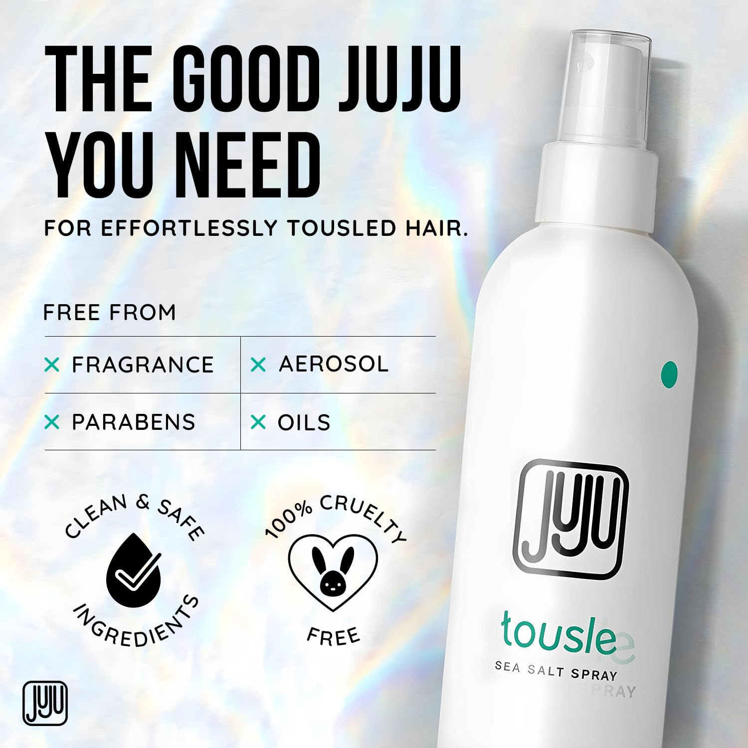 - ARTIFICIAL FRAGRANCE-FREE FORMULA FOR SENSITIVE USERS: Juju's Tousle Sea Salt Spray with new formulation - 100% clean contains no added artificial perfume, making it ideal for those with skin sensitivities who want to avoid irritation. Achieve natural, beachy waves with our texture spray designed for effortless styling. The formula is comfortable and free from overpowering smells, making it ideal for those who prefer minimal fragrance. Use daily for easy, worry-free styling with soft, wavy hair.