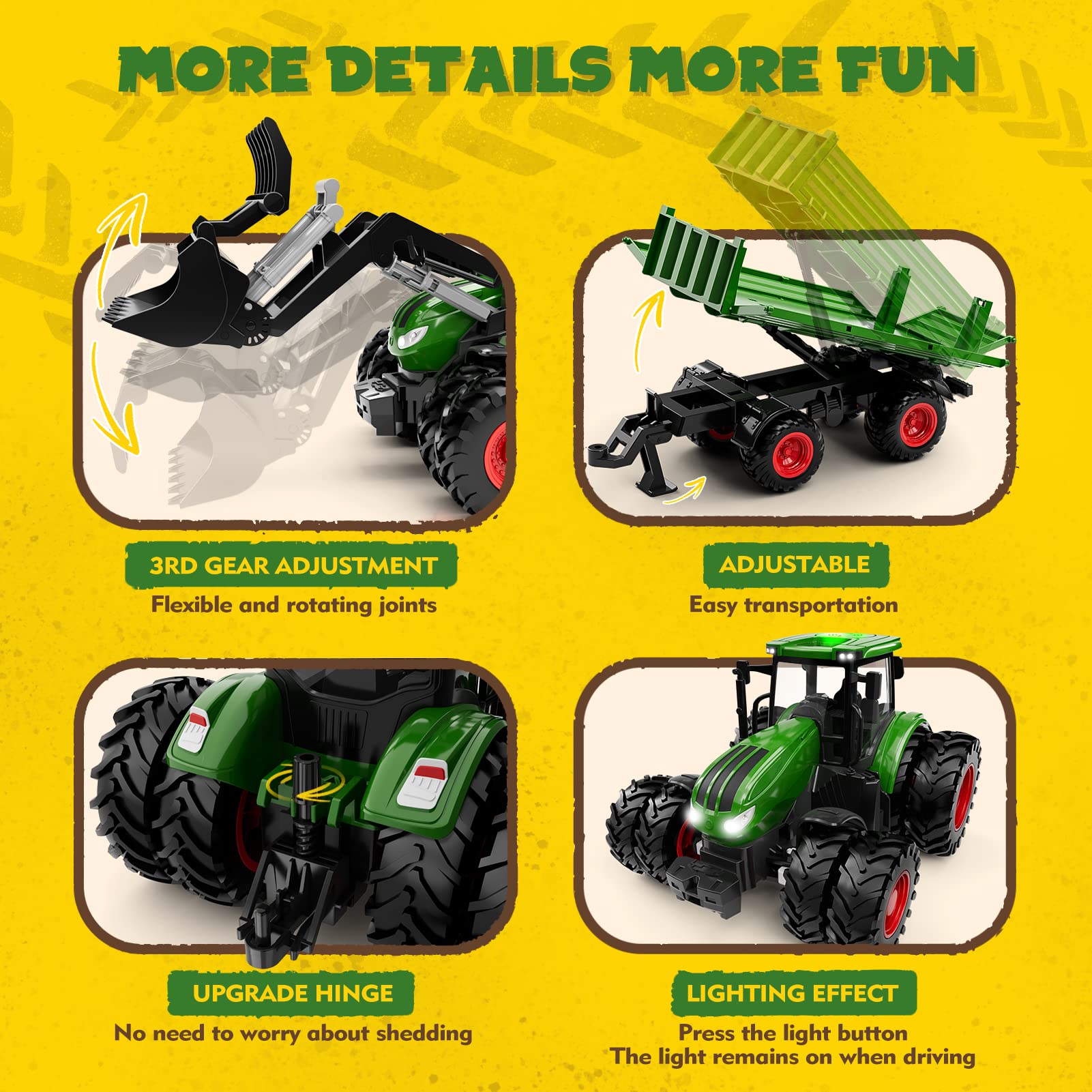 - 8-WHEEL & ALLOY HEAD: Compared with the old 4-wheel plastic tractor, the upgraded alloy head with a powerful 8-wheel combination provides strong power and stability, no problem when driving on the carpet, sandbox or rough terrain. 6 moving directions and work like a real tractor, remember to turn on the lights (Press the light button. The light remains on when driving)